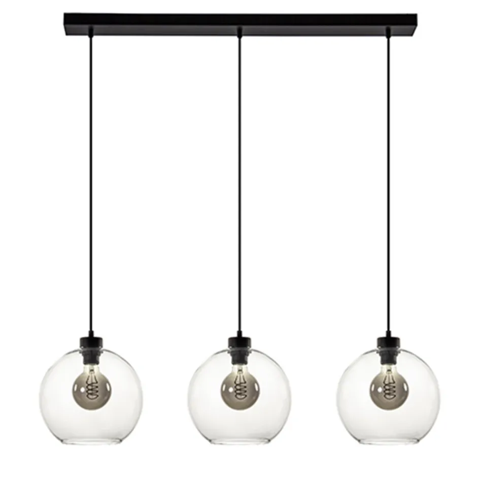 Glas hoeft niet saai te zijn, dat bewijst deze moderne 3-lichts hanglamp. De glazen bollen hebben een moderne uitstraling en met het zwarte snoer en plafondbalk krijgt de lamp ook een Scandinavisch tintje. De glazen bollen zijn van onder open en hangen aan een zwart stof omwonden snoer die in hoogte verstelbaar is.