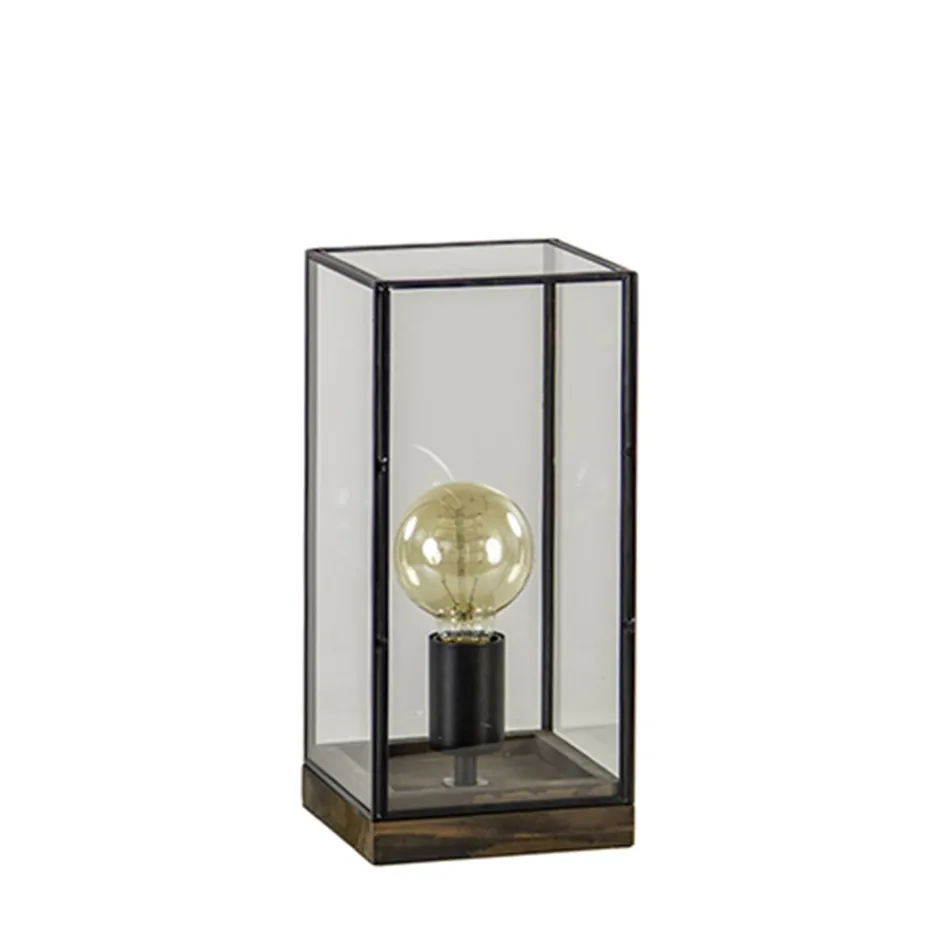 De combinatie van materialen in deze lamp maakt dat deze perfect geschikt is in een landelijke setting. De tafellamp doet denken aan een stolp en werkt ook op dezelfde wijze, de glazen kap is namelijk volledig te verwijderen. De glazen tafellamp heeft een houten voet waar de zwarte fitting in zit verwerkt. De glazen kap is afgewerkt met een zwart metalen frame, dit geeft de tafellamp een wat robuustere look. De lamp staat leuk op een dressoir of kast en wordt geleverd inclusief snoer met schakelaar.