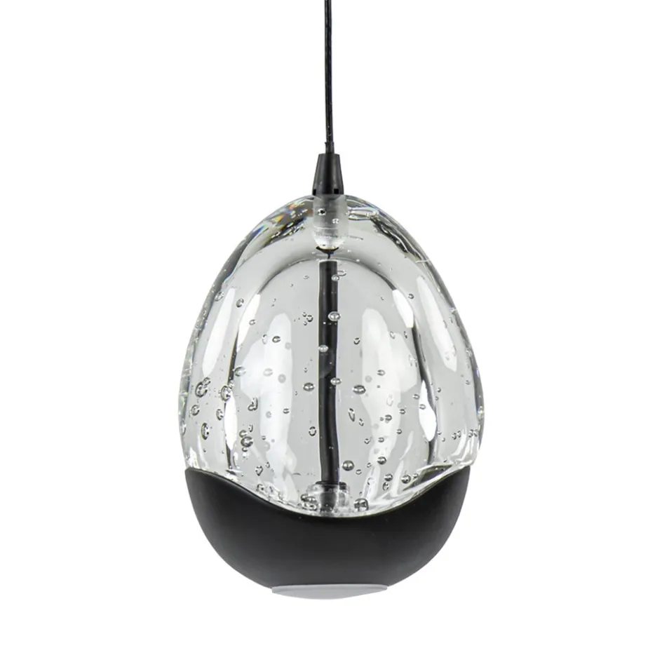 Een sfeervolle toevoeging voor boven een bijzettafel of boven een nachtkastje. De kap is gevormd als een ei en voorzien van LED verlichting. De kap is deels van massief glas en deels mat zwart metaal. Dit geeft de hanglamp een stoere uitstraling. Het glas is voorzien van luchtbelletjes wat de hanglamp een speels effect geeft. De verlichting geeft direct licht naar beneden door middel van de spot onderop het ei, en daarnaast ook indirect licht doordat het ei van binnenuit verlicht wordt. De hanglamp is gemakkelijk in te nemen mocht deze te hoog zijn. De hanglamp is dimbaar middels een externe LED dimmer (exclusief).