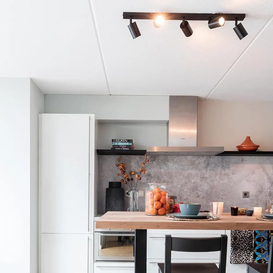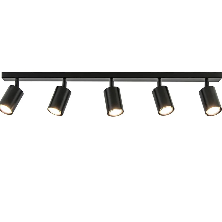 Heeft u een lange hal of kamer? Dan is dit de ideale lamp om de ruimte goed uit te lichten. Deze 5-lichts opbouwspot heeft een strakke moderne afwerking en past gemakkelijk in diverse woonstijlen. De langwerpige plafondspot is gemaakt van metaal en uitgevoerd in het mat zwart. De cilinder vormige spots zijn naar wens te verstellen door deze te draaien en/of te kantelen. Zo kunt u ze gemakkelijk verstellen en zo de ruimte op de beste wijze uitlichten. De 5 spots zijn bevestigd op een smalle balk van 80 cm die net als de spots in het mat zwart is afgewerkt. De moderne opbouwspot wordt geleverd zonder lichtbron (5x GU10) en is dimbaar middels een externe dimmer (exclusief).