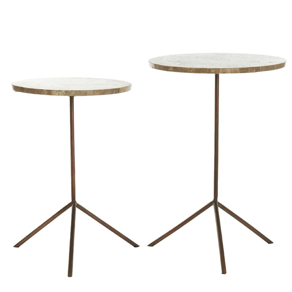 Deze trendy bijzettafel set van 2 maakt het interieur helemaal af. De tafeltjes hebben een unieke look omdat deze zijn gemaakt van travertin steen. Het stenen blad wordt ondersteund door slanke metalen pootjes in het antiek brons. Een leuke combinatie die prima geschikt is voor diverse woonstijlen.