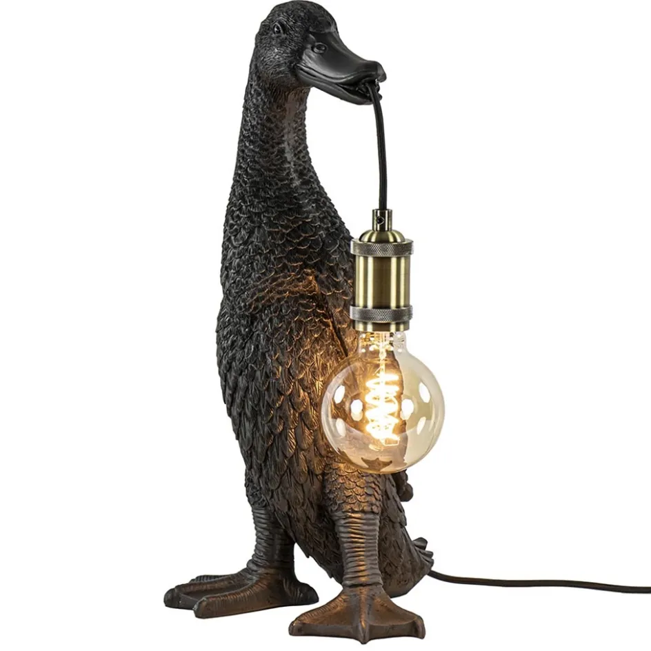 Dieren in het interieur zijn helemaal hip en happening. Zo zijn ze te vinden in prints, als accessoires maar ook als verlichting. Zo ook deze leuke tafellamp Duck. De tafellamp van Light and Living is uitgevoerd in het mat zwart. De eend houdt een bronzen fitting in z’n snavel. Erg leuk voor op een dressoir, bijzettafel of zelfs het nachtkastje. De zwarte tafellamp is voorzien van een zwart snoer met een lengte van 140 cm en wordt geleverd zonder lichtbron.