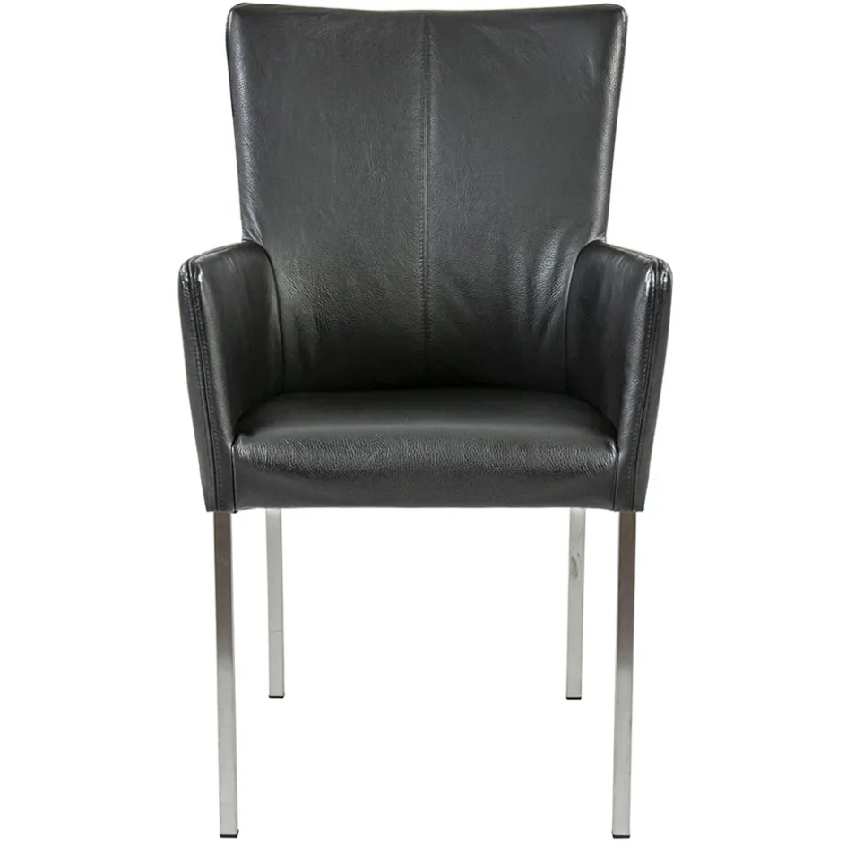 Deze moderne eetkamerstoel is uitgevoerd met een lederen zitting in het zwart. Dit geeft de armstoel een luxe moderne uitstraling die mooi matcht bij de slanke RVS poten. Het leder is mooi afgewerkt en gestikt in dezelfde kleur als de zitting zelf. De rugleuning van de eetkamerstoel is wat hoger wat een extra zitcomfort geeft en de armleuning zorgt tijdens het natafelen voor een fijne zit.