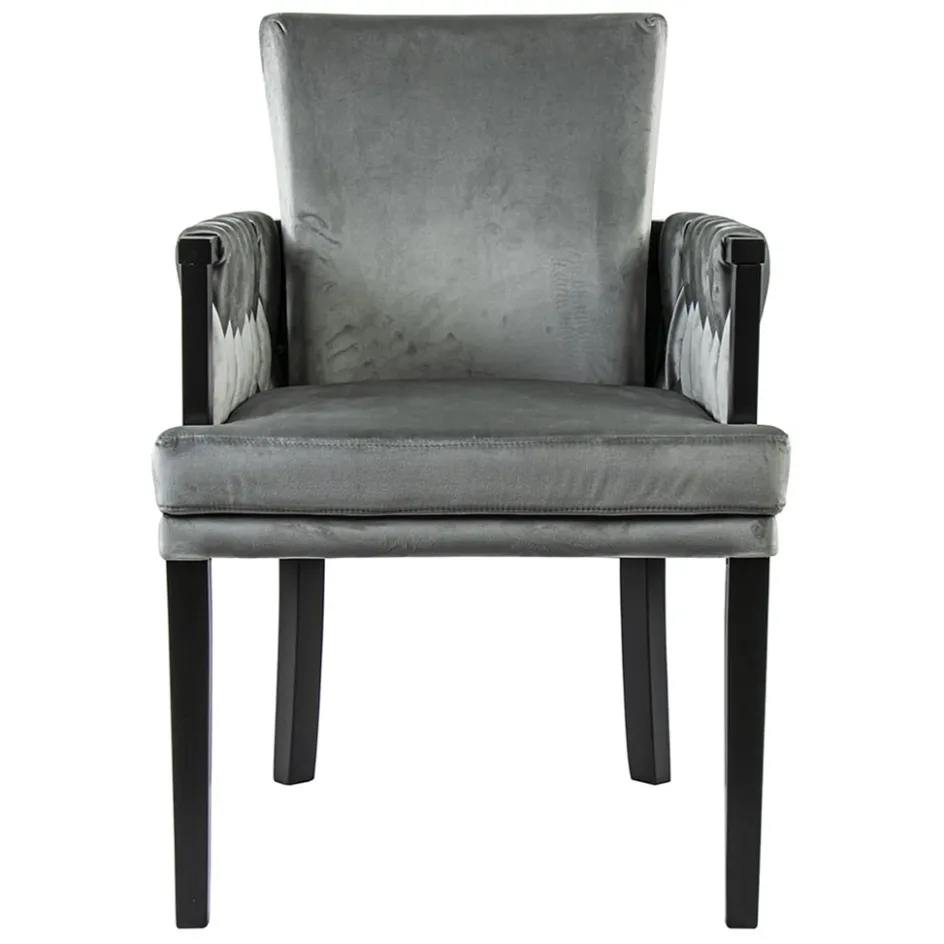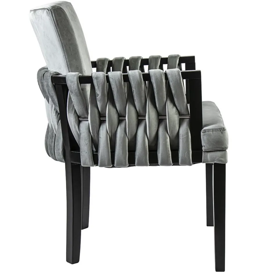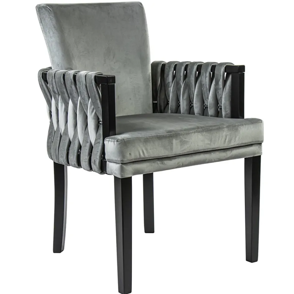 Met deze chique eetkamerstoel maakt u de eetkamer helemaal af. De luxe stoel heeft een hoogwaardig zitcomfort en is voorzien van mooie details. Zo heeft de armstoel een sierlijke leuning die verder doorloopt in de rug. In deze leuning is een zilveren stang geplaatst waar de stof mooie doorheen is gevlochten. Dit geeft de stoel een luxe uitstraling wat wordt versterkt door de velourse stof. De poten zijn van hout en uitgevoerd in het zwart. Een verrijking voor de eetkamer en een genot om op te zitten.