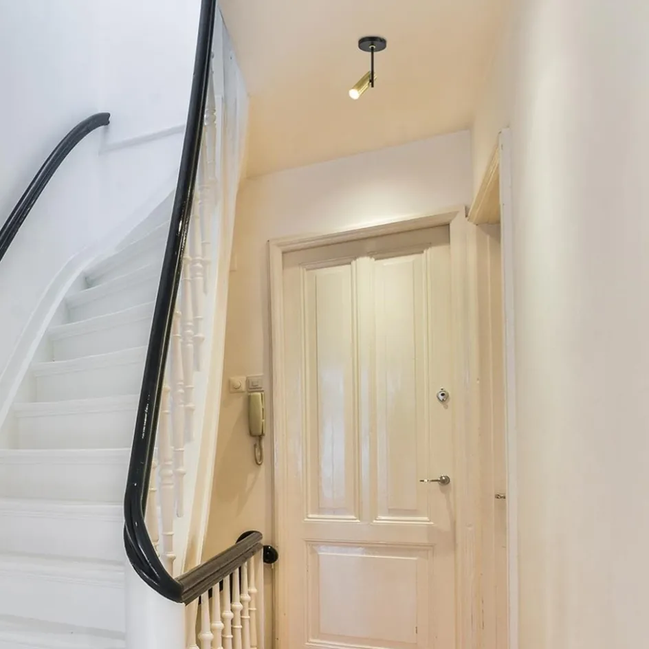 Een mooie opbouwspot met een hoog design gehalte. De 1-lichts plafondspot heeft een smal design wat zorgt voor een moderne look. De cilinder-vormige kap kan worden versteld door deze te draaien en/of te kantelen. Ideaal voor het uitlichten van een donkere hoek of object. De moderne opbouwspot is gemaakt van metaal en uitgevoerd in het mat zwart met brass goud. De cilinder kan worden opengedraaid zodat de lichtbron gemakkelijk kan worden geplaatst.