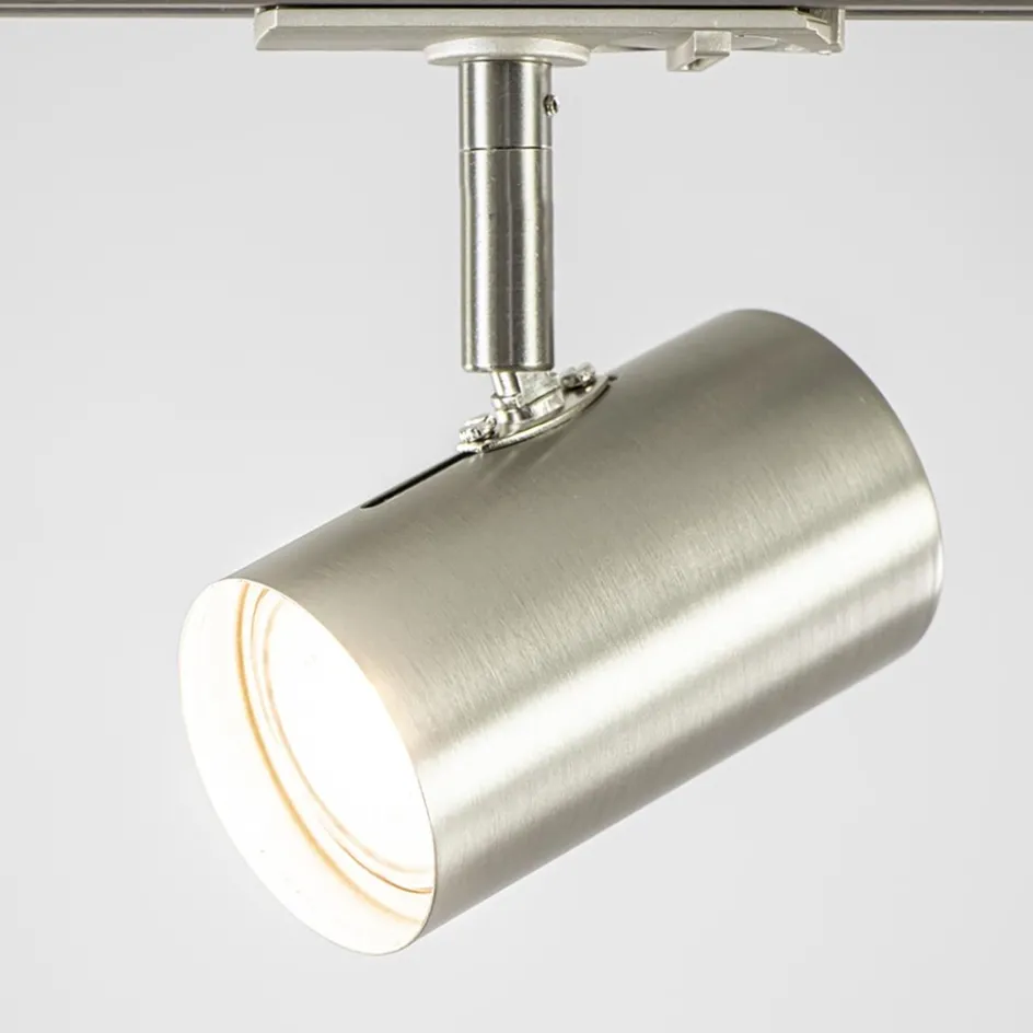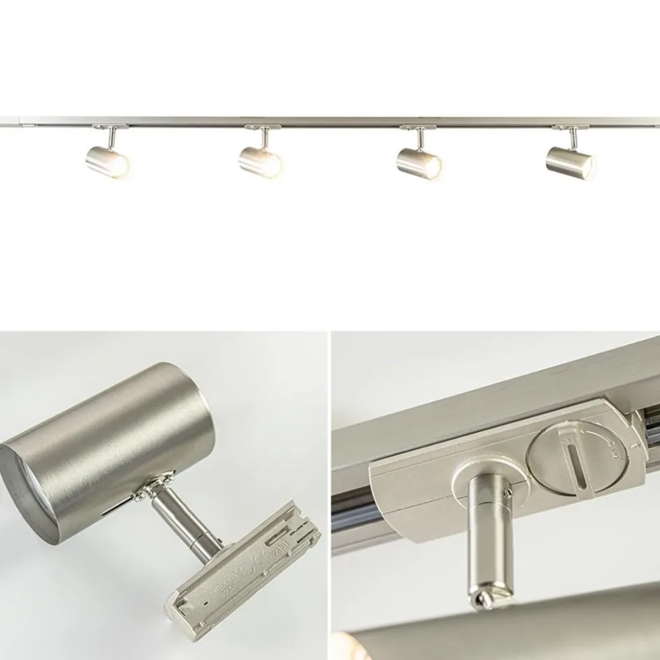 Ideaal om een ruimte extra uit te lichten of meer sfeer aan te brengen. Dit 1-fase railsysteem wordt geleverd inclusief 4 spots, beide uitgevoerd in het nikkel. De rail heeft een lengte van 150 cm waar de spots gemakkelijk op kunnen worden verdeeld. Druk de spot in de rail en zet hem vast door de knop om te zetten. De spots kunnen verder nog draaien en kantelen. Bepaal dus zelf hoe u het licht wilt verspreiden. Het railsysteem heeft 1-fase, dit houdt in dat alle lampen tegelijk zullen worden in- en uitgeschakeld. Handig voor in een lange hal of slaapkamer, maar ook in de keuken of woonkamer past dit systeem perfect. De smalle rail en de cilindervormige spots geven een strak en modern geheel aan de ruimte. Het nikkel railsysteem is dimbaar met een externe dimmer.