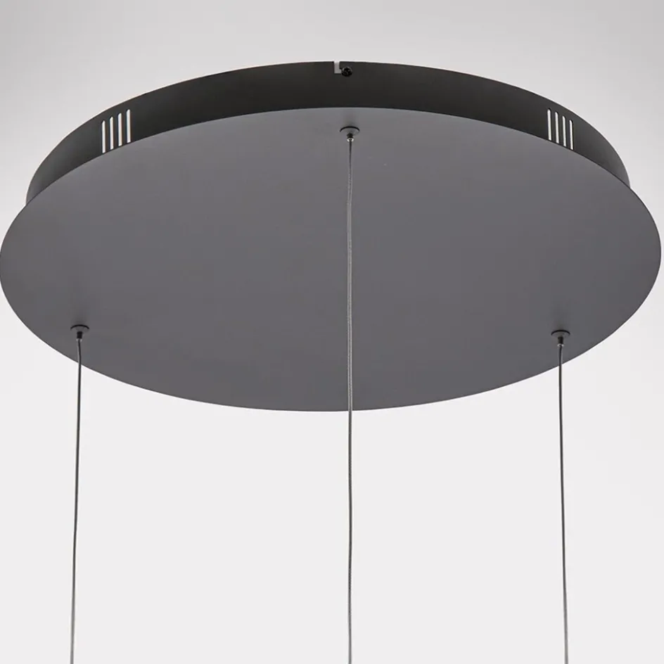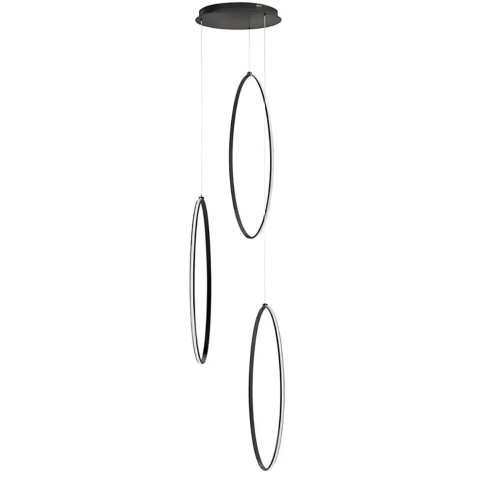 Een moderne luxe hanglamp die perfect geschikt is voor een vide. De moderne hanglamp heeft een maximale hoogte van 350 cm en is naar wens te verstellen. De lamp bestaat uit drie zwarte ovale ringen welke aan de buitenzijde zijn voorzien van een LED strip. Het LED geeft met 2700 Kelvin een sfeervolle warm witte verlichting en zorgt met 8640 lumen voor een goede lichtopbrengst. De drie ovale LED ringen zijn los van elkaar in hoogte te verstellen zodat u deze zo kunt hangen dat ze het beste in uw vide uitkomen. De zwarte hanglamp wordt met een ronde bevestiging aan het plafond opgehangen.