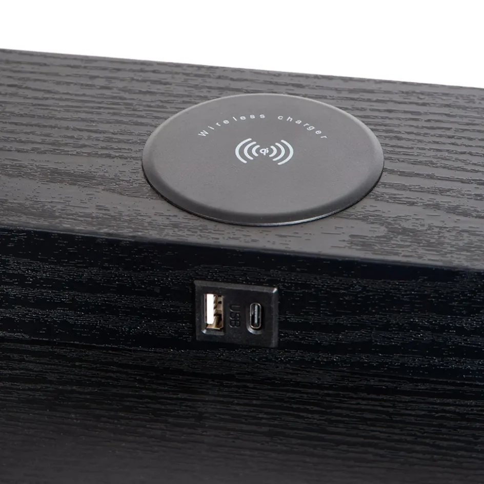 Deze sfeervolle vloerlamp is gemaakt van hoogwaardig mdf en uitgevoerd in het mat zwart. Dit is mooi gecombineerd met een beige kantoenen kap die zorgt voor diffuus licht in de ruimte. Leuke eigenschap van deze vloerlamp is het oplaadplatform op het bovenste plankje. Deze is voorzien van USB aansluitingen en een draadloze oplader. Ideaal voor in de woonkamer of slaapkamer. De overige plankjes zijn prima geschikt om wat leuke accessoires, plantjes of boeken op neer te zetten. De zwarte vloerlamp met kap is voorzien van een snoer met een lengte van 180 cm en wordt gemakkelijk aan en uit geschakeld dmv de nostalgische trekschakelaar onder de kap.