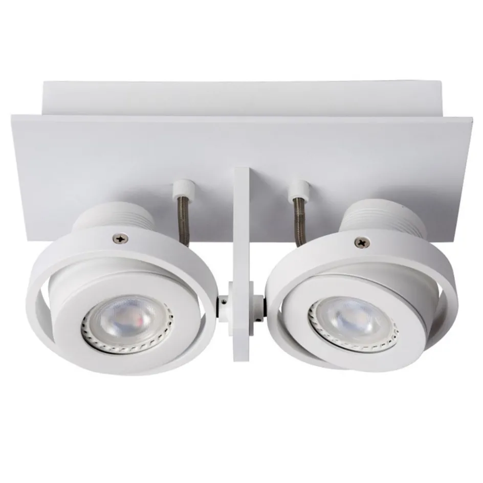 Een moderne plafondspot met een industrieel randje. De aluminium spot is voorzien van een matte witte finish en wordt geleverd inclusief LED. Voordeel van het LED is dat het energiezuinig is, maar daarnaast ook een dim to warm functie heeft. Dit houdt in dat de 2-lichts LED spot kan worden gedimt dmv een externe dimmer (exclusief) naar een zachtere warmere verlichting met een Kelvin tussen de 3000 en 2200. Ideaal voor in een woon- of slaapkamer. Beide spots zijn 360° te draaien en zijn kantelbaar zodat u deze naar wens kunt stellen. De ronde spots zijn bevestigd op een aluminium plaatje die weer vast zit aan de rechthoekige bevestiging. De witte opbouwspot is prima geschikt voor diverse ruimtes en doeleinden, en is dan ook te bestempelen als multifunctioneel.