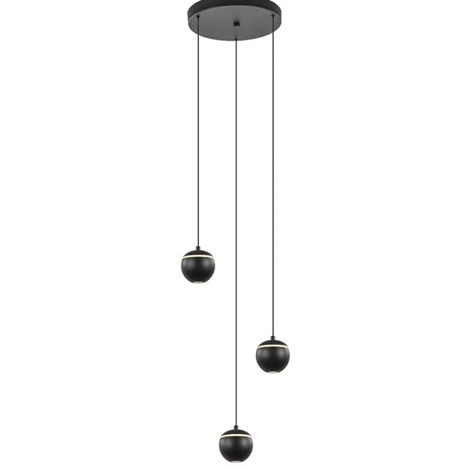 Deze moderne 3-lichts hanglamp is klein van formaat maar groots van effect. De hanglamp heeft 3 bollen die ieder zijn voorzien van LED verlichting. Zo zit er een spot verwerkt in de onderzijde van de bol en doordat de bol een opening heeft, is er ook een lichtpunt verwerkt in de bol. De spot zorgt dat het oppervlak onder de lamp goed wordt uitgelicht en de opening zorgt meer voor diffuus licht en extra sfeer. De bollen zijn zwart van buiten en goud van binnen. Ze hangen aan dunnen draden die naar wens zijn in te korten. De maximale hoogte van de 3-lichts ronde LED hanglamp is 150 cm.