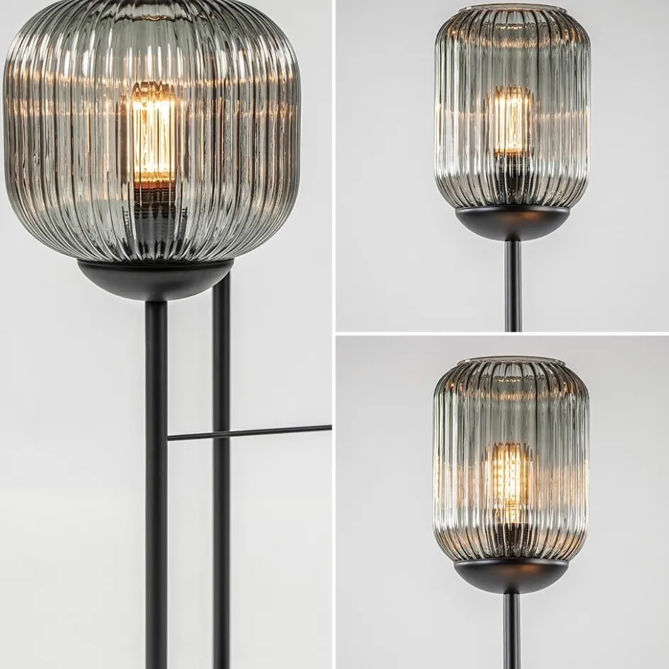 Een chique lamp met een retro twist. De vloerlamp bestaat uit een metalen armatuur dat is voorzien van een mat zwarte finish. Het armatuur heeft 3 niveaus waar de smoke glazen kappen op worden geplaatst. Zo ontstaat er een speelse verdeling in de lamp. De smoke glazen kappen benadrukken het chique effect mede door de donkere kleur, maar ook door het reliëf in het glas. De vloerlamp is voorzien van een zwart snoer met een lengte van 320 cm. De schakelaar bevindt zich op 170 cm in het snoer. De staande lamp wordt geleverd exclusief lichtbron.