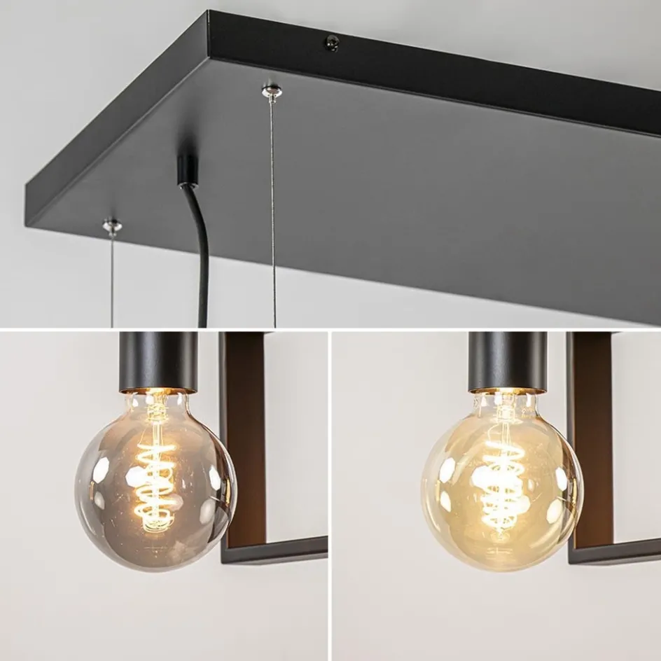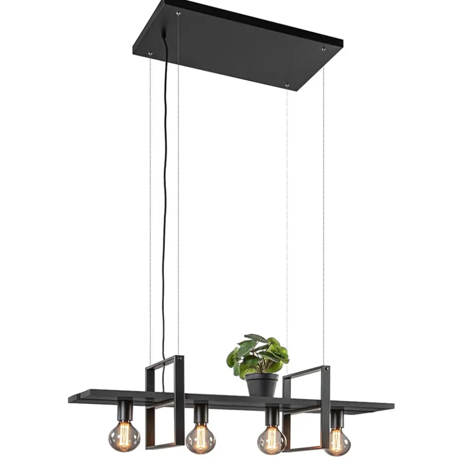 Perfect voor boven een kookeiland of eettafel. De langwerpige hanglamp met frame zorgt voor zowel sfeer als extra decoratie. De hanglamp is namelijk voorzien van twee houten planken waar u leuk een plantje of decoratie op kunt zetten. De planken worden los op het frame gelegd dus het is aan te raden om niet al te zware dingen erop te zetten. Het frame is gemaakt van metaal en uitgevoerd in het mat zwart. De combinatie van het zwart en hout maakt de lamp geschikt voor diverse woonstijlen. Het frame is aan de onderzijde voorzien van vier E27 fittingen en hangt aan vier staaldraden waarmee u de hoogte gemakkelijk kunt verstellen. De grote metalen bevestiging maakt de lamp helemaal af.