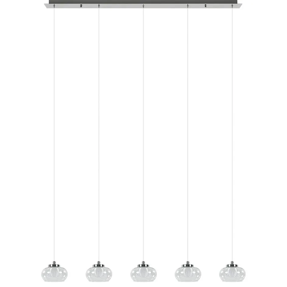 Deze moderne hanglamp is dé ideale lamp voor boven uw eettafel. De 5-lichts LED hanglamp heeft een mooi strak design en is voorzien van een 3-standen functie. Dit houdt in dat de lamp in 3 standen is te dimmen, en dat gewoon via de wandschakelaar. Schakelt u de lamp aan, dan brand deze op zijn felst, zet u de lamp uit en weer aan dan dimt deze naar de volgende stand. Herhaalt u dit? Dan brand de lamp op zijn zachts. Zo creëert u gemakkelijk en snel de juiste sfeer om bij te werken of te dineren. De hanglamp is verder voorzien van chromen details en helder glazen kappen. Het heldere binnenglas zorgt voor een mooi effect en tevens voor een fijne lichtverspreiding. Met 2700 Kelvin geeft de LED hanglamp een sfeervolle warm-witte verlichting die geschikt is voor iedere situatie. De combinatie van het chroom met het glas zorgt dat de lamp in diverse woonstijlen is te combineren.