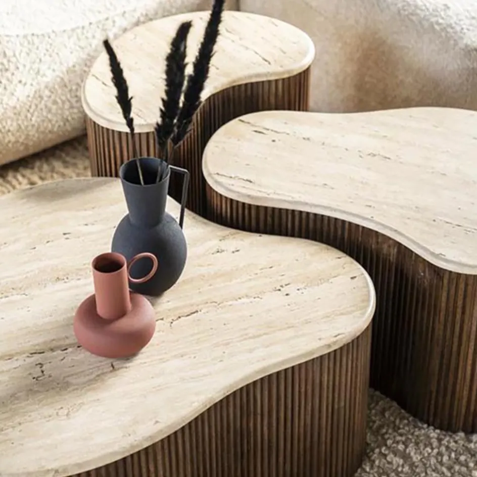 Deze bijzettafel heeft een unieke en organische vorm. De tafel is gemaakt van mangohout met een natuurstenen blad. Het blad is gemaakt van Travertin. Travertin is een robuuste kalksteen. Hierdoor is ieder blad uniek. Deze bijzettafel komt in drie verschillende vormen en afmetingen. Deze vormen passen mooi in elkaar als een set.