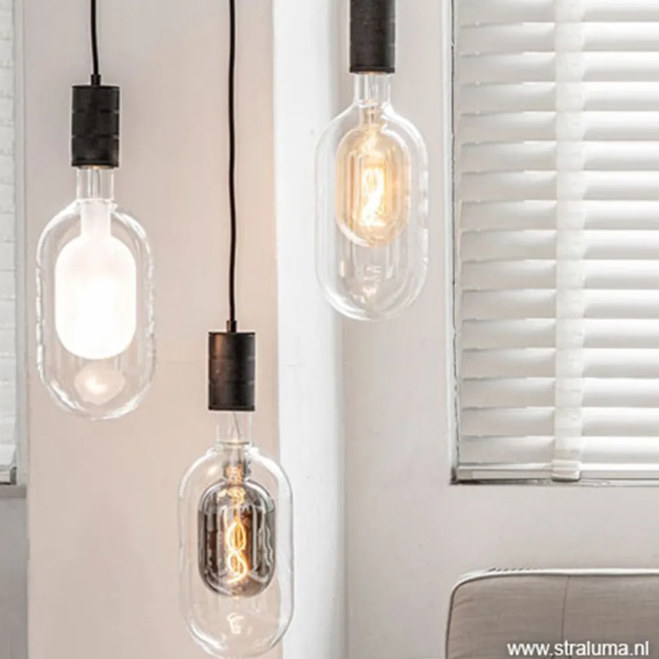 Het dubbele glas van deze lichtbron is moeilijk te maken. Het lamp-in-lamp effect is echter zeer de moeite waard. Het zorgt voor een mooie reflectie van het licht. Prachtig in een eenvoudige pendel, maar ook mooi in een grote groep. Deze design lichtbron geeft, ondanks het koele glas, mooi extra warm licht. Het buitenste glas is helder, het binnen glas heeft een diepe titanium glans.
