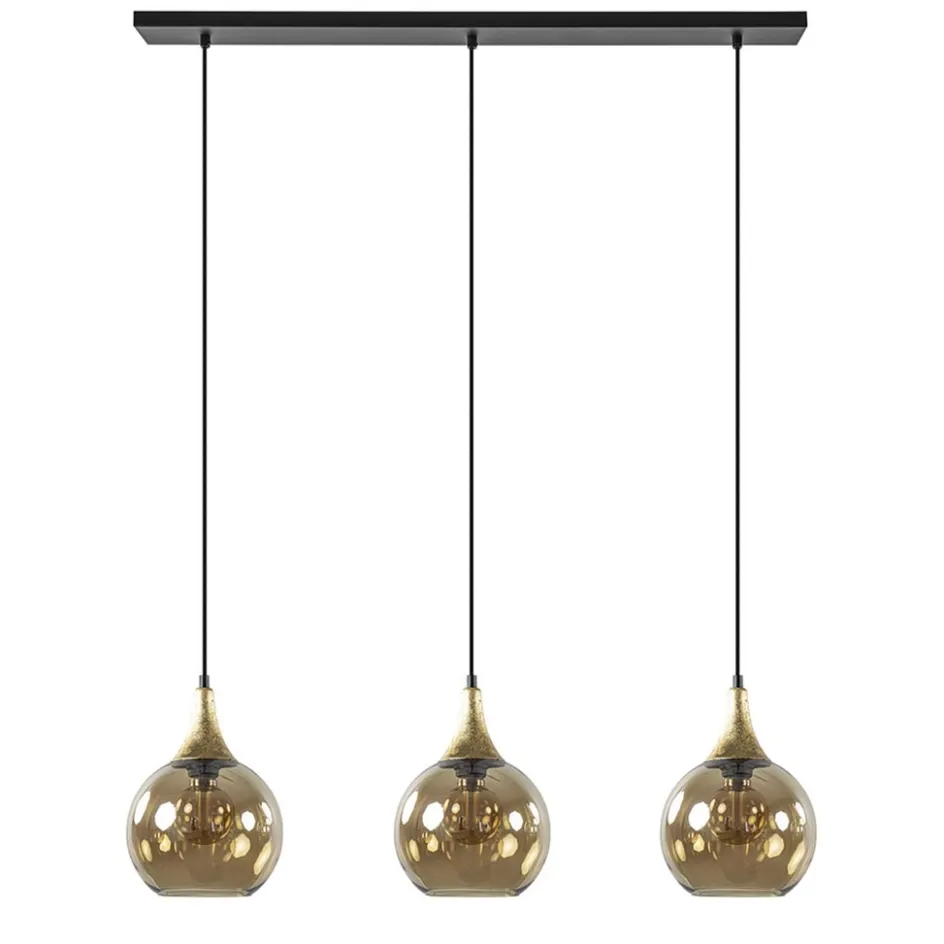 Deze prachtige 3-lichts hanglamp is een mooie toevoeging aan een chic of klassiek interieur. De hanglamp heeft een zwart armatuur en is voorzien van zwarte stof omwonden snoeren. Deze zijn naar wens in te korten, de maximale hoogte van de lamp is 150 cm. De 3 lichtpunten zijn afgewerkt met een pendel met bladgoud look die mooi is gecombineerd met amber glazen bollen. Deze hebben een doorsnede van 20 cm en zijn van onder open om gemakkelijk de lichtbron te plaatsen. De 3-lichts glazen hanglamp past perfect boven een eettafel vanaf 2 meter. De amber glazen hanglamp is dimbaar middels een externe dimmer (exclusief) en wordt geleverd exclusief lichtbron.
