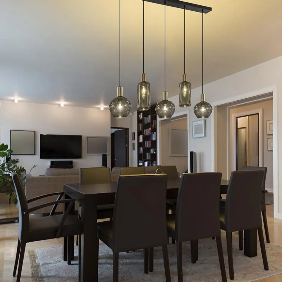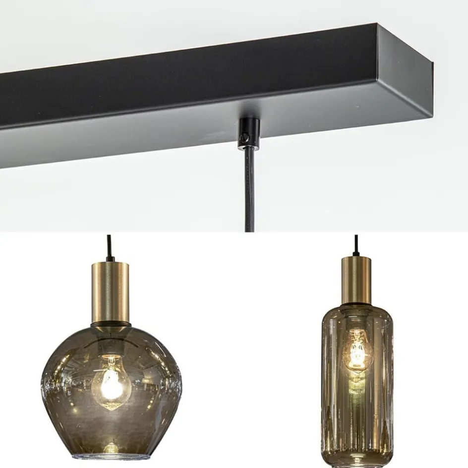 Een prachtige hanglamp voor boven een eettafel of kookeiland. Deze 5-lichts hanglamp heeft een stijvolle look die mooi matcht in diverse woonstijlen als klassiek, hotel chic of luxury. De vijf snoeren zijn naar wens op hoogte te hangen, met een maximale hoogte van 150 cm. De eettafelhanglamp is voorzien van vijf smoke glazen kappen verdeeld over twee afmetingen. Het donkere glas is gecombineerd met een bronzen fitting wat de lamp een extra chique uitstraling geeft. De 5-lichts videlamp wordt bevestigd met een mat zwarte balk van 130×8 cm en is dimbaar middels een externe dimmer (exclusief).