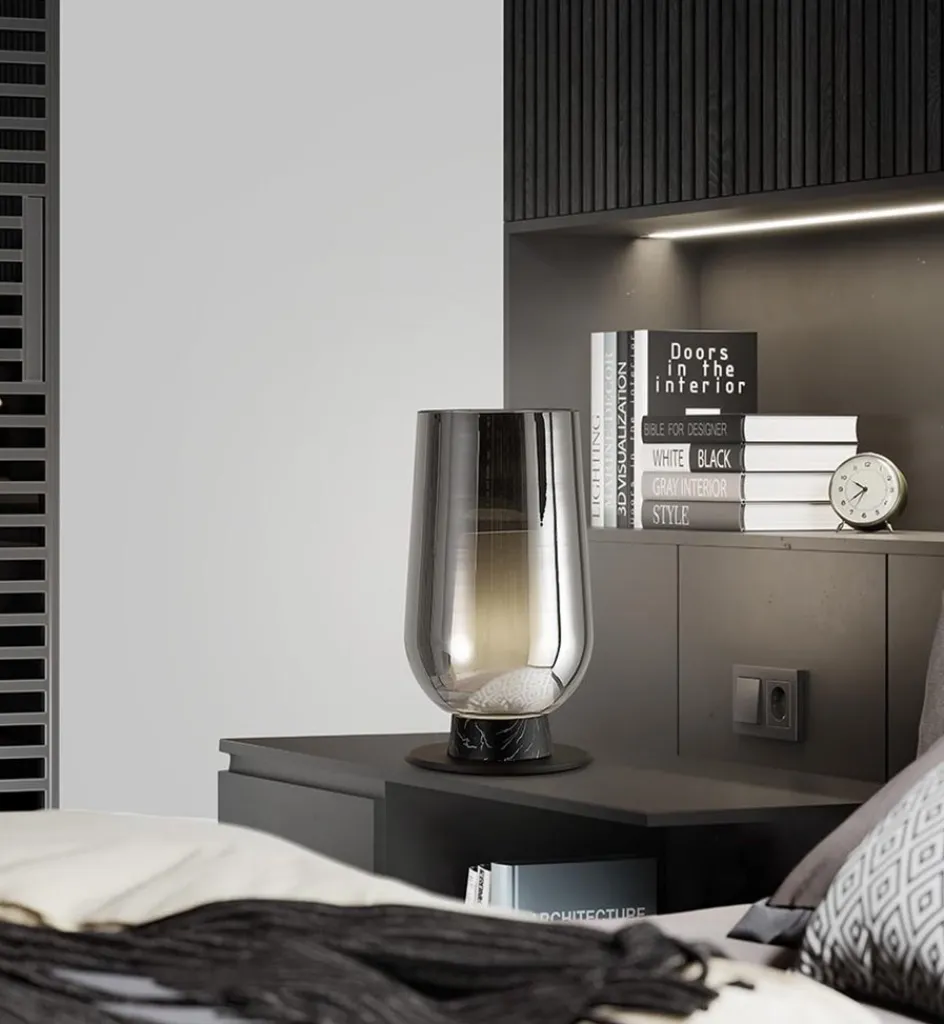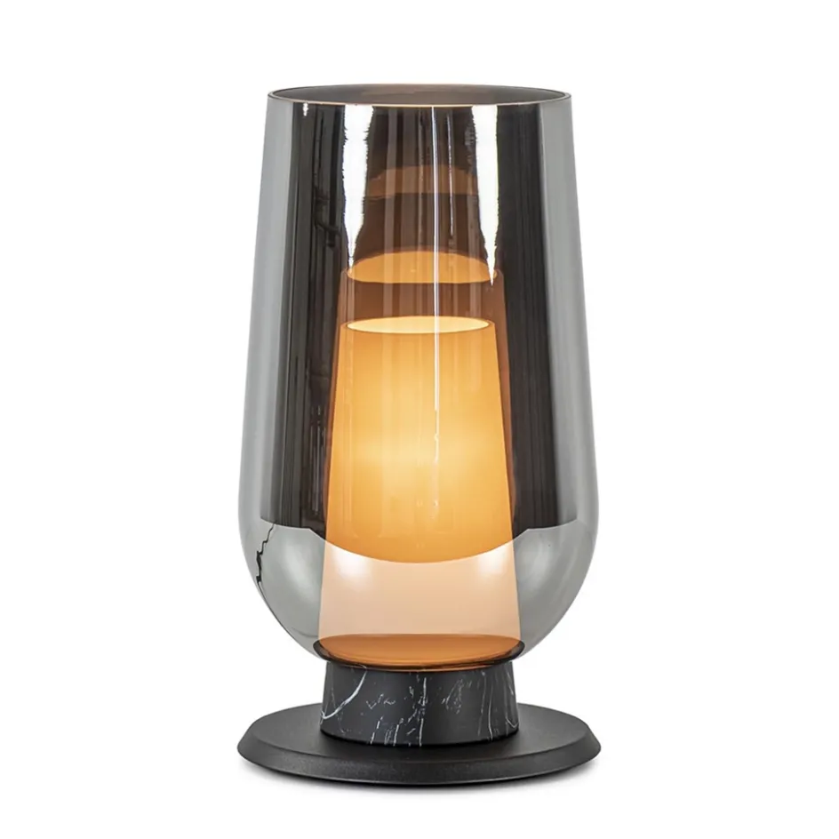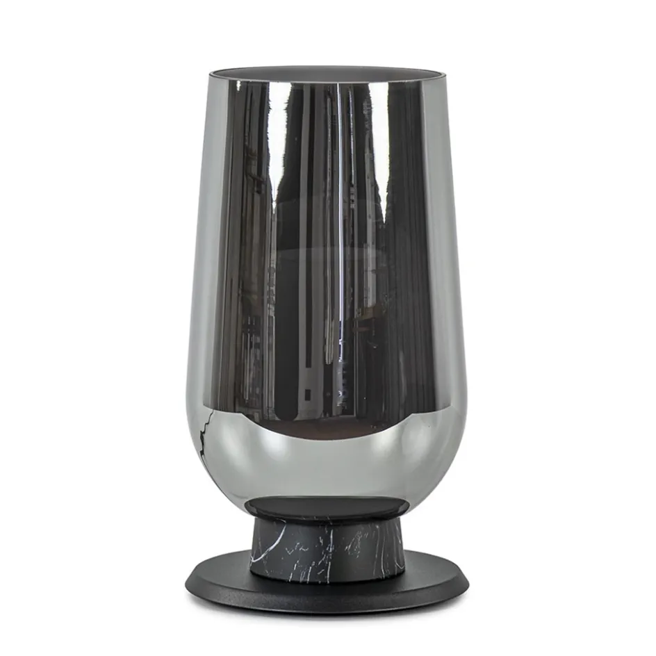 Een chique tafellamp met een luxe uitstraling. De tafellamp is voorzien van luxe materialen als zwart marmer en smoke/titanium glas. Het glas heeft een wit binnen glas wat de tafellamp een mooi effect geeft als de verlichting aan staat. Een sfeervolle toevoeging voor op een dressoir, bijzettafel of het nachtkastje. De tafellamp wordt inclusief snoer van 180 cm geleverd. De schakelaar bevindt zicht op 30 cm van het armatuur.