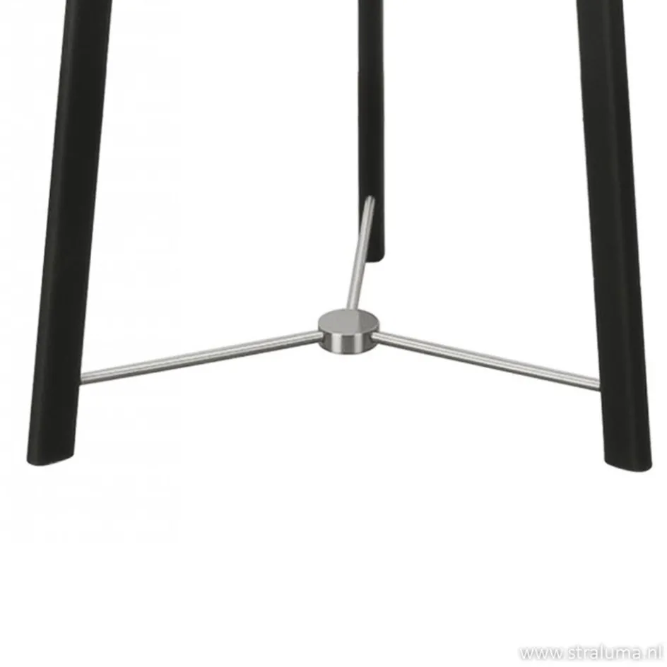 Prachtige design vloerlamp driepoot. Deze nieuwe trendy staande lamp is uitgevoerd in metaal, gecombineerd in twee kleuren, staal en zwart. De kap van deze schemerlamp is van linnen en in de kleur gebroken wit. De vloerlamp is prachtig afgewerkt.