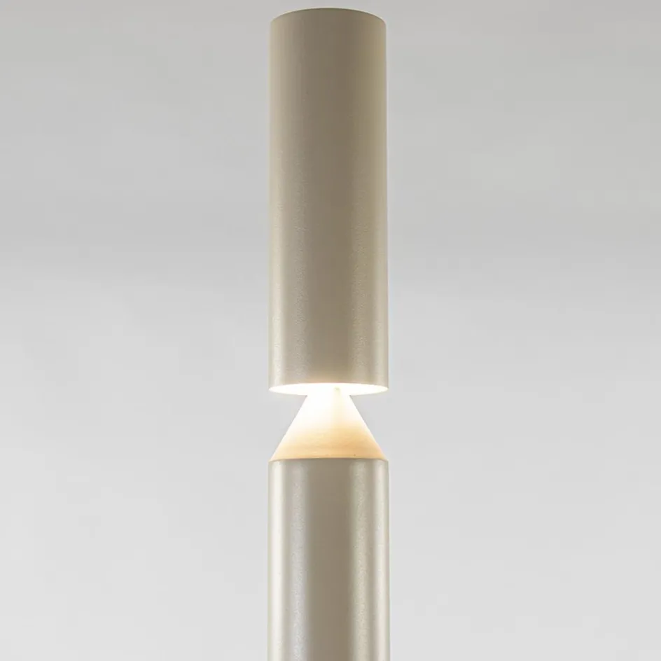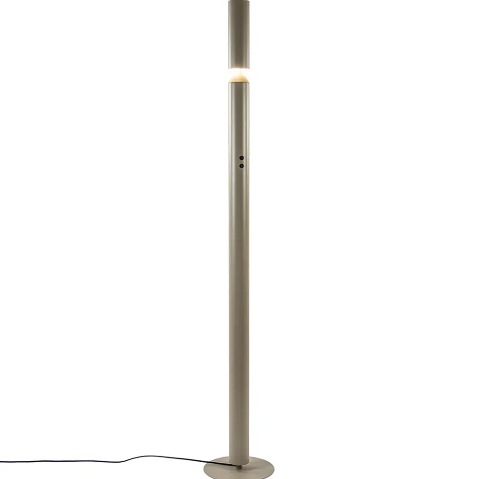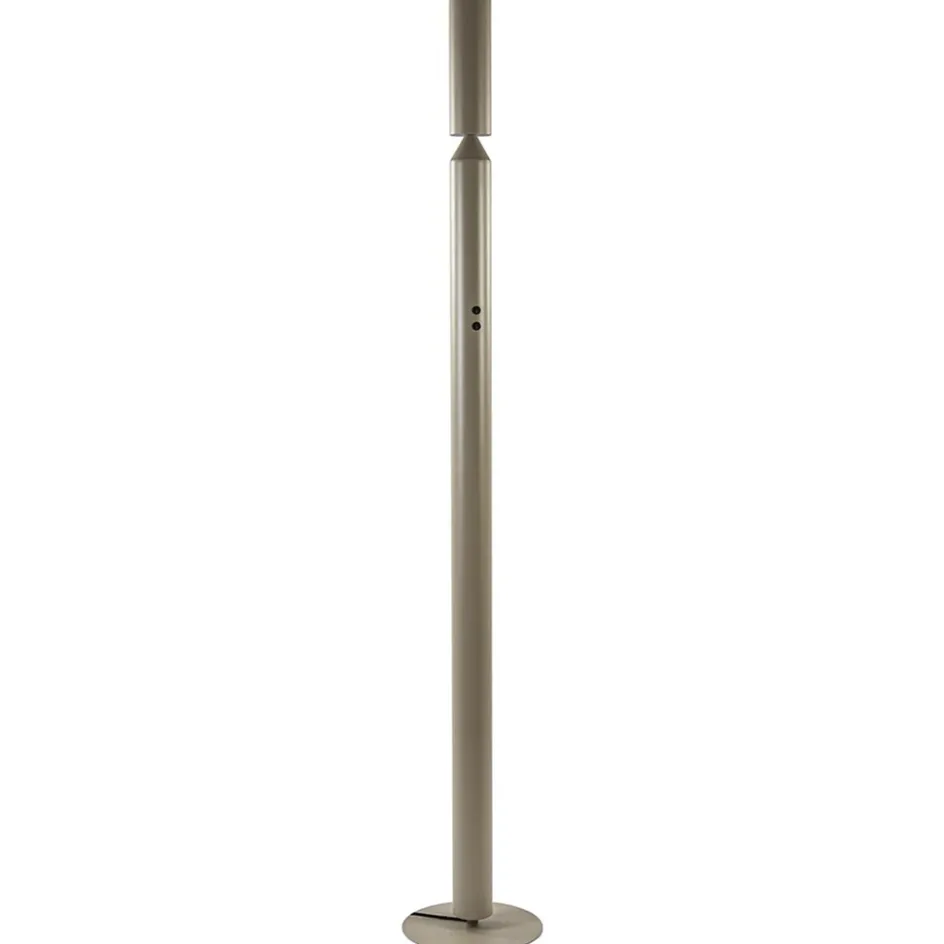 Strakke mat beige vloerlamp. Deze staande lamp past goed in een design interieurstijl. De simpelheid van de vloerlamp maakt hem heel stijlvol. De vloerlamp heeft zowel aan de bovenkant als aan de onderkant van het kleine kapje een lichtbron. Deze zijn apart van elkaar te bedienen met de knopjes die op het armatuur zitten. De staande lamp wordt zonder lichtbronnen geleverd.