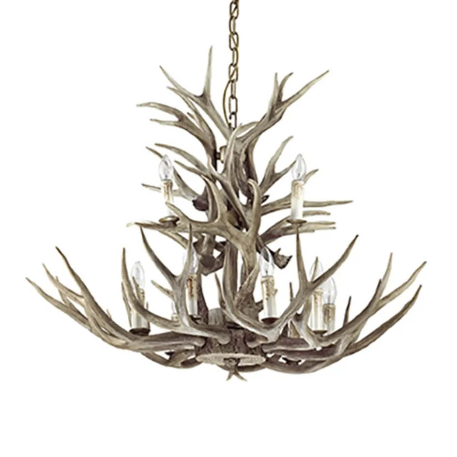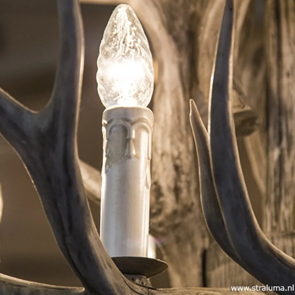Deze grote ‘kroonluchter’ van geweien geeft het interieur een unieke twist. De nagemaakte geweien geven een landelijk gevoel terwijl de lichtbronnen in de vorm van een kaars een klassieke touch geven. De grote hanglamp doet het goed in een landelijk interieur en past mooi boven een grote tafel. Ook in een vide zou deze grote lamp niet misstaan. De kroon is voorzien van twaalf lichtbronnen en hangt aan een metalen ketting die is in te korten.
