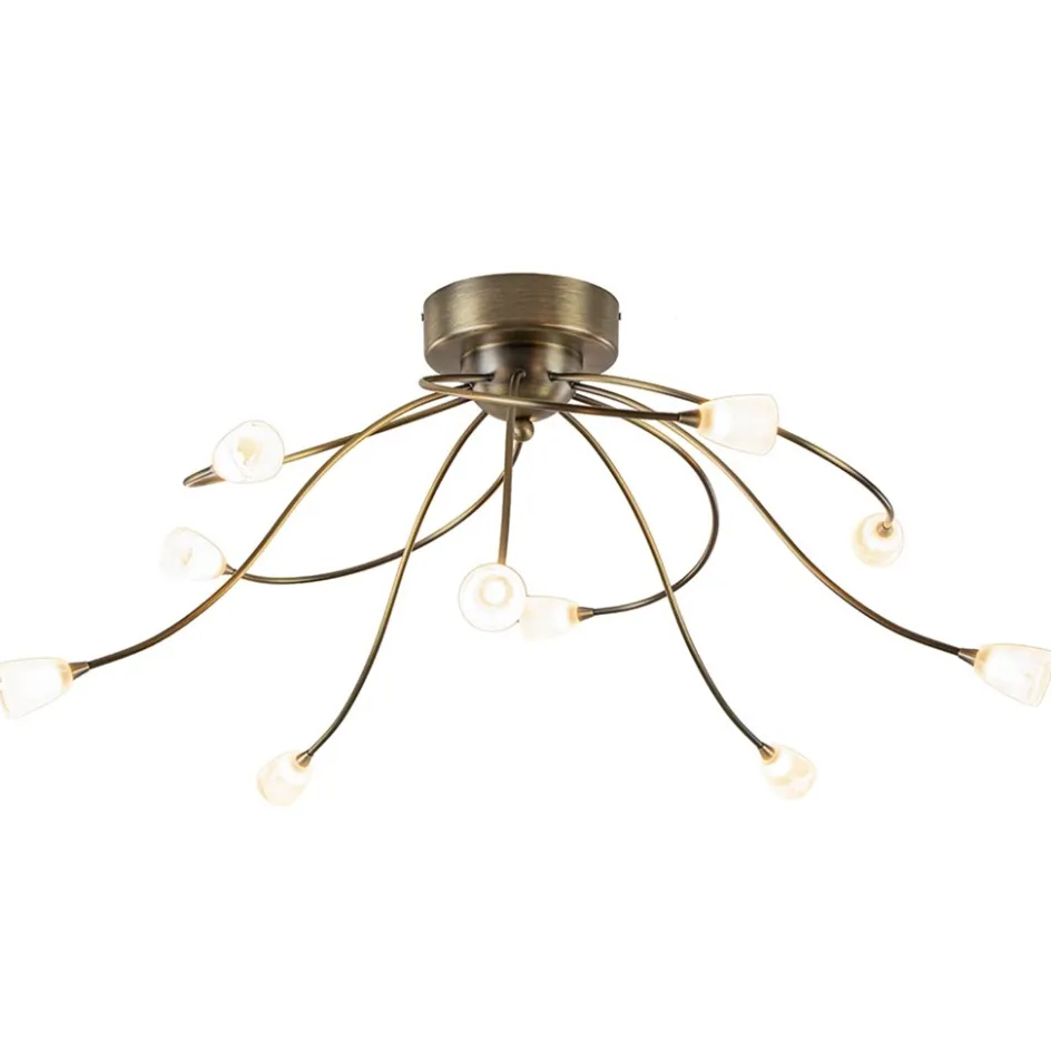 Deze grote ronde plafondlamp is een mooie toevoeging aan een woonkamer of slaapkamer. De 10-lichts plafondlamp is uitgevoerd in het brons en gecombineerd met wit gevlamd glas. De klassieke plafondlamp heeft een modern jasje doordat deze is voorzien van geïntegreerd LED met een dim to warm functie. Dit houdt in dat de lamp kan dimmen in kleurtemperatuur. Hier is wel een geschikte dimmer voor nodig, deze wordt niet meegeleverd.
