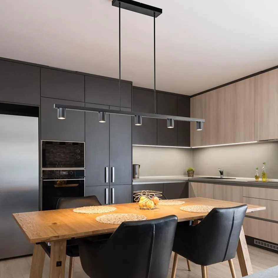 Ideaal voor boven uw bureau in het kantoor, boven uw eettafel of uw kookeiland. Deze moderne hanglamp 5-lichts mat zwart heeft een eenvoudig en luxe design, waardoor deze perfect past in een modern, luxe of design interieur. De zwarte hanglamp is in hoogte verstelbaar door de imbusschroefjes los te draaien en het armatuur verder uit te trekken. De hanglamp is dimbaar, maar wordt geleverd exclusief dimmer. Ook wordt de lamp geleverd exclusief lichtbronnen (GU10). Heeft u interesse in deze lamp, maar houdt u van een eleganter geheel? Deze lamp is ook verkrijgbaar in een zwarte/goud variant! Ook kan er de keuze gemaakt worden voor een kleinere 5-lichts variant.