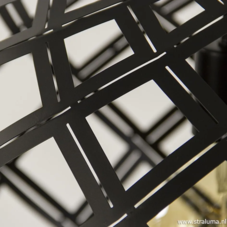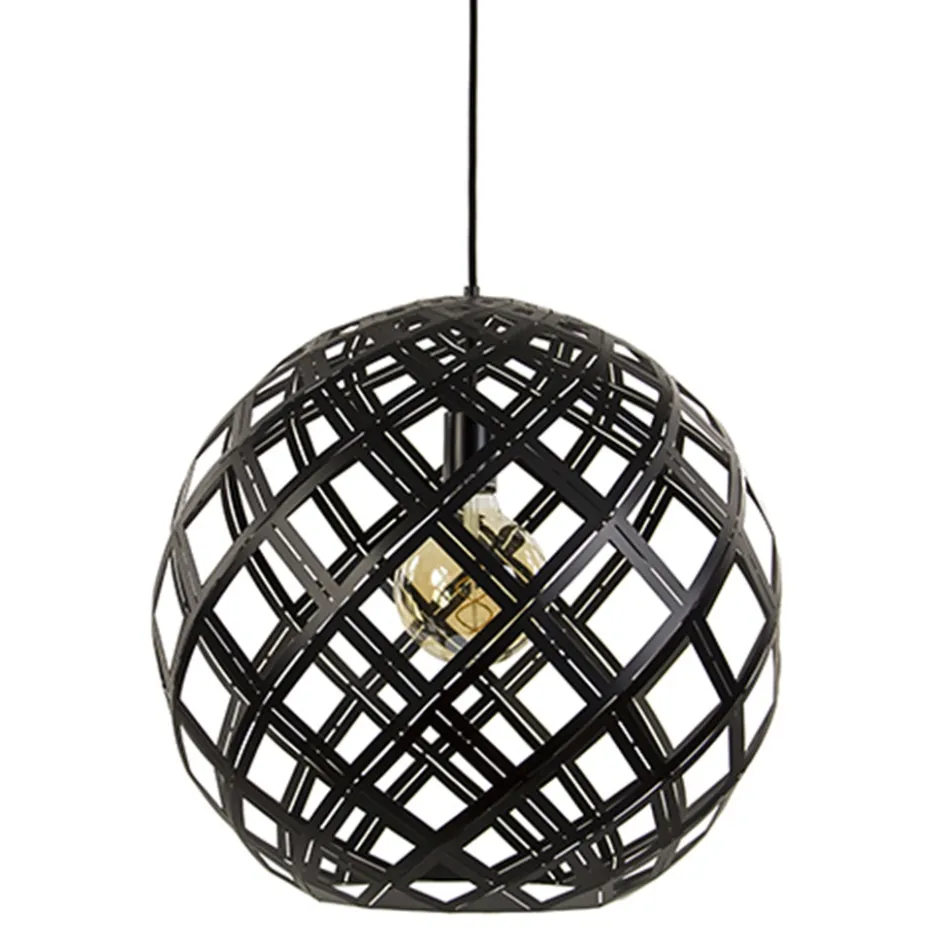 Deze grote metalen hanglamp geeft een Scandinavisch tintje aan het interieur. De mat zwarte hanglamp heeft door de open structuur een gevlochten effect wat de kap een speelse uitstraling geeft en een mooie lichtverdeling. De ronde kap heeft een rechte onderkant met grote opening waardoor het makkelijk is om de lichtbron te vervangen. De bovenzijde van de kap is dicht en verloopt in het zwarte strijkijzersnoer.