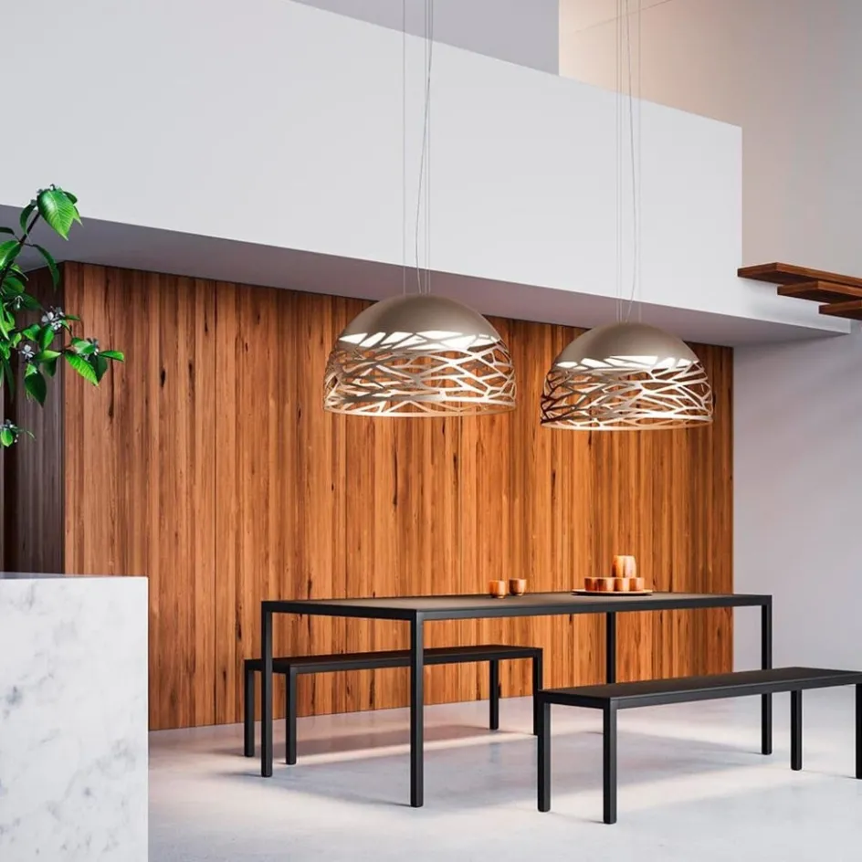 Het meest bekende model van Studio Italia Design is een hanglamp welke luistert naar de naam Kelly. Wonder mooi vormgegeven lampen met gracieuze detaillering. Deze fraaie open hanglamp is in meerdere afmetingen en kleuren leverbaar. En wel in wit, bruin-brons, zwart en nu ook in het champagne. Het eenvoudige, maar elegant gelaserde design patroon, is in vrijwel elk interieur toe te passen. De glazen diffuser zorgt ervoor dat u niet direct in de lichtbron kan kijken en deze brengt mede zeer sfeervol licht tot stand. De hanglamp dient te worden voorzien van 3 lichtbronnen (E27)
