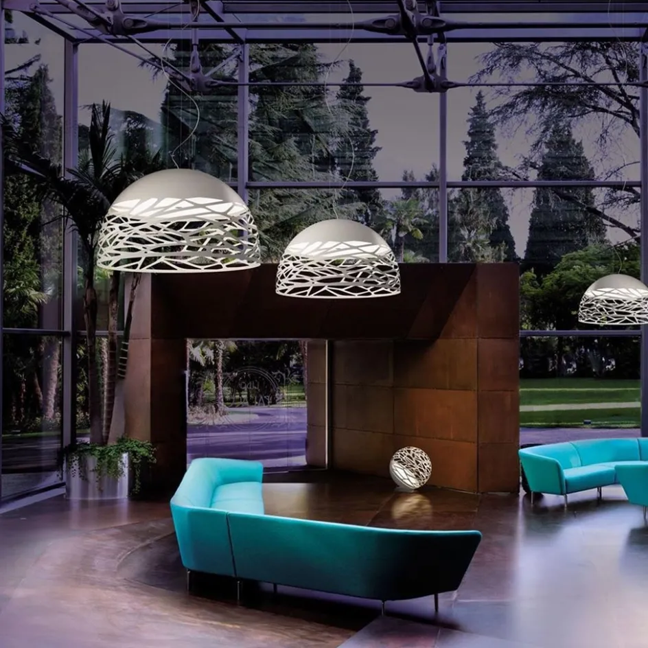 Deze prachtige koepel vormige hanglamp is het sterk staaltje Italiaans design. Staat super in een design of modern interieur. Uitgevoerd in wit metaal met een mat glazen melk witte diffuser, zo kijkt u niet direct in de lichtbron. De mooie opengewerkte rand geeft een prachtig licht/schaduw spel zowel als de lamp brand als wanneer deze uit is. Met dit grote model maakt u direct een statement.