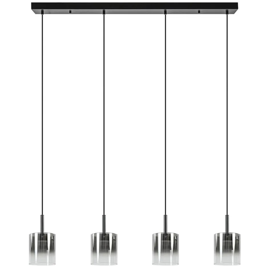 Met deze luxe eettafelhanglamp wordt dineren een nog groter genot. De 4-lichts hanglamp is voorzien van glazen kappen met een speciaal effect. In het glas zit een verloop van titanium/smoke naar helder. Deze overgang geeft de glazen kappen een luxe chique uitstraling die mooi kan worden gecombineerd in een strak klassiek, modern of luxe interieur. De cilinder kappen worden op de fittingen bevestigd met drie schroefjes. Binnenin het glas bevindt zich een extra glas met een LED module. Deze zorgt met 2700 Kelvin voor een fijne warme verlichting en met 1800 lumen voor een goede opbrengst. De verlichting is dimbaar met de juiste LED dimmer (exclusief). De moderne LED hanglamp wordt aan het plafond bevestigd met een mat zwarte balk van 110 cm.