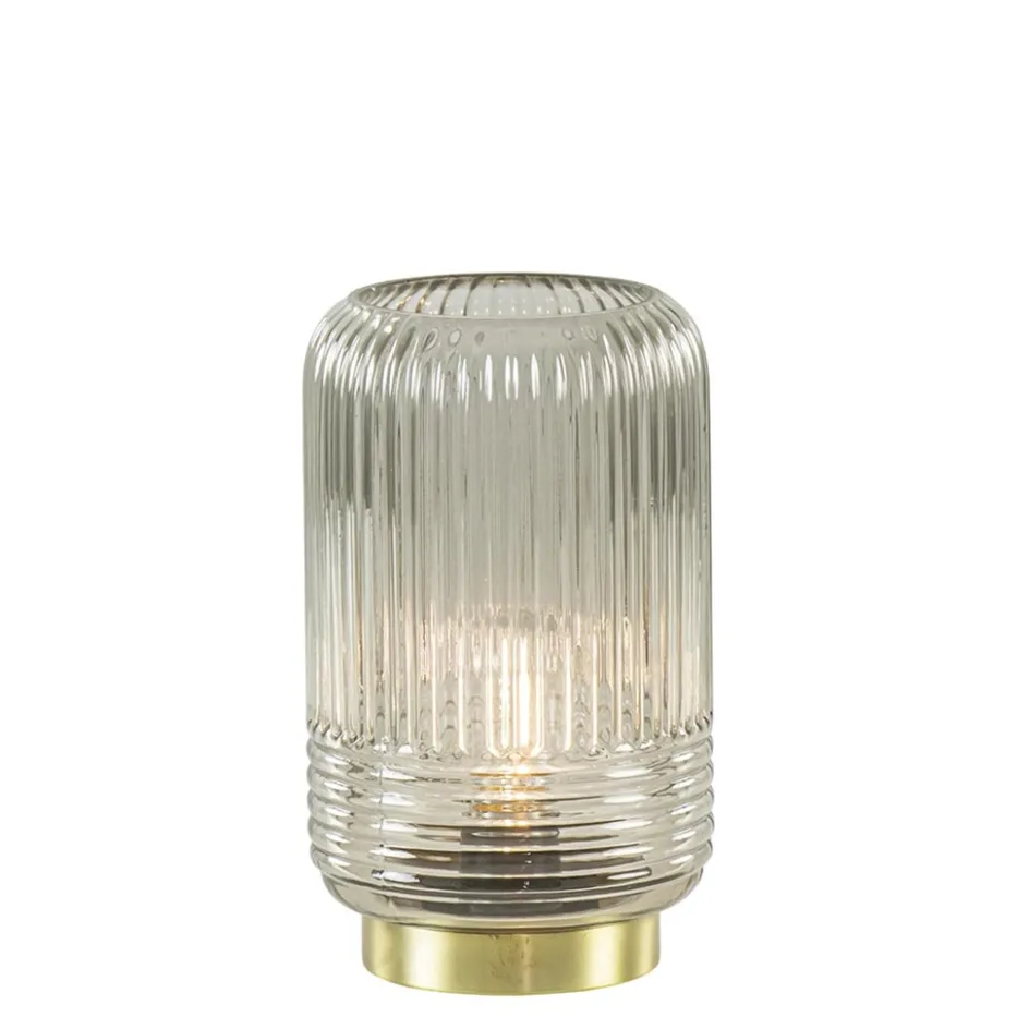 Dit tafellampje van glas met een goud/messing voetje is één en al sfeer. Het half-transparante warm-grijze ribbel glas geeft het licht een prachtig effect. De ribbels in het glas lopen aan de onderkant horizontaal, daar boven zijn de ribbels verticaal. Dit geeft deze eenvoudig ogende tafellamp een bijzonder tintje. Fijn is ook dat het lampje werkt op 2 AAA-batterijen (excl), hierdoor is het echt overal te plaatsen. van de woonkamer tot de slaapkamer of de studentenkamer! Mooi in een klassiek, luxe of Scandinavisch interieur.