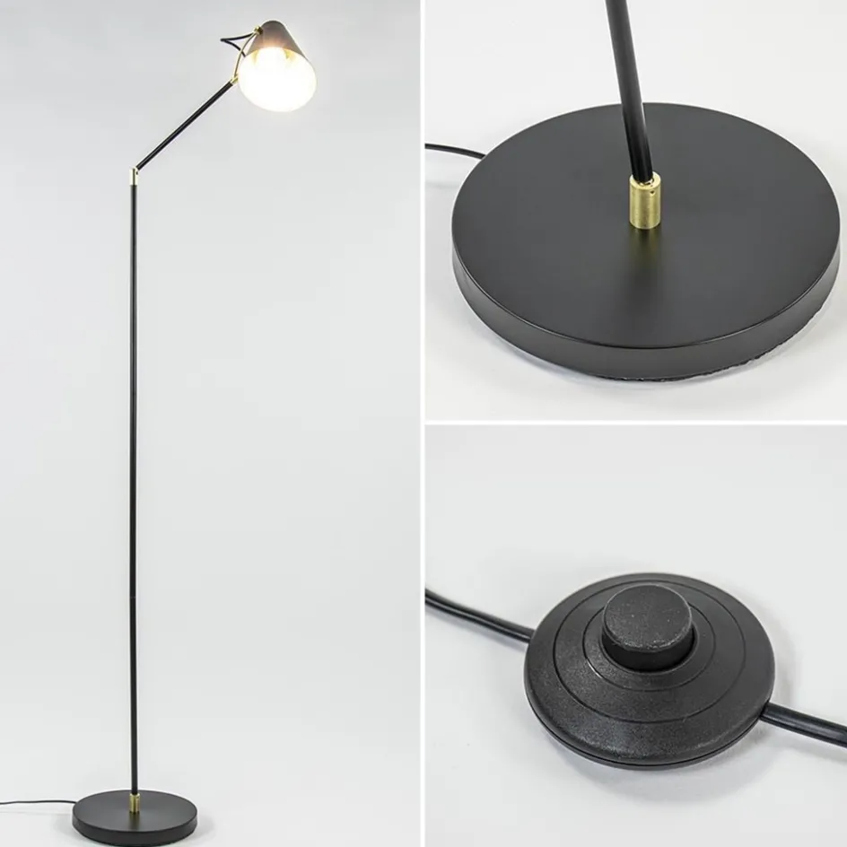De vloerlamp Barre is een ideale huisgenoot. De zwart met gouden vloerlamp is op diverse plekken te verstellen. Zo kan de arm van het armatuur op twee plekken kantelen en kan de zwarte kap ook nog draaien. Zo kunt u de lamp altijd zo zetten dat hij het beste verlicht. Ideaal wanneer u de lamp naast uw bank gebruikt als leeslamp of voor het uitlichten van een donkere hoek. Het snoer loopt netjes door het armatuur en heeft vanaf de voet nog een lengte van 190 cm, waarbij er een voetschakelaar op 40 cm van de voet zit. Vloerlamp Barre wordt geleverd zonder lichtbron (E27).
