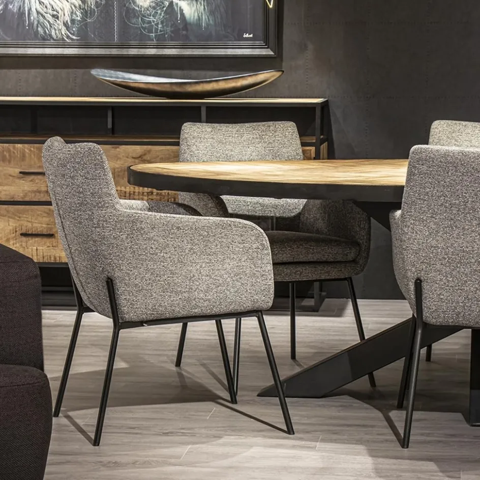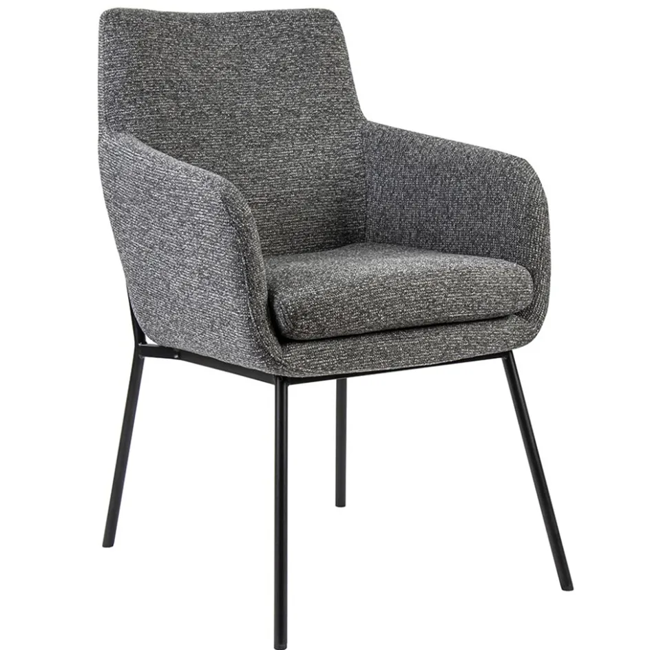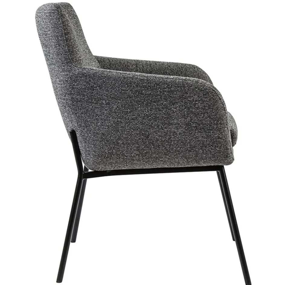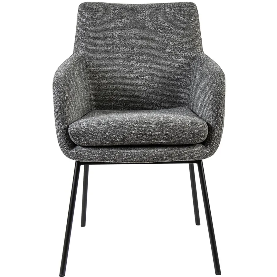 Een prachtige eetkamerstoel in een gemeleerde stof. De armstoel heeft een comfortabele zitting en de armleuningen bieden extra ondersteuning tijdens het dineren en natafelen. De stoffen zitting heeft een metalen onderstel die is voorzien van een zwarte finish. Dit geeft de stoel een moderne look. De slanke pootjes houden het geheel lichtig en open.