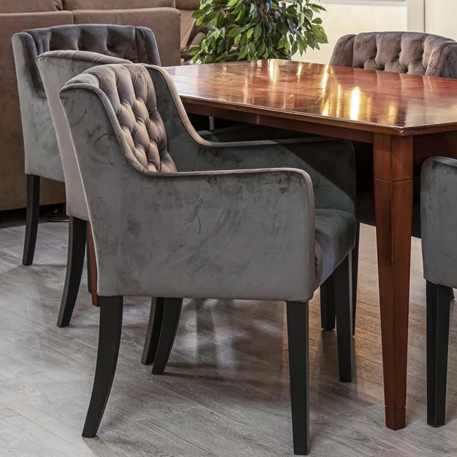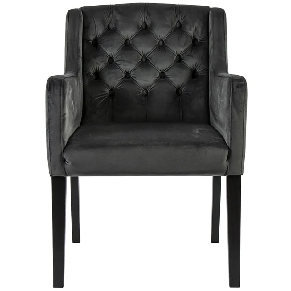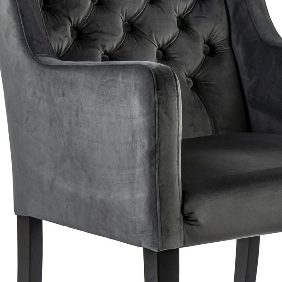 Deze prachtige eetkamerstoel is een verrijking voor het interieur. De luxe stoel heeft een comfotabele zitting die is uitgevoerd in het velvet mid grey. De rugleuning is aan de binnenzijde gecapitonneerd wat de luxe chique uitstraling extra benadrukt. De stoel heeft eiken houten poten die zijn uitgevoerd in het mat zwart. Alles bij elkaar maakt de stoel prima geschikt voor een hotel chic, luxury of strak klassiek interieur. Dineren wordt in ieder geval en groot plezier in deze fijne armstoel.
