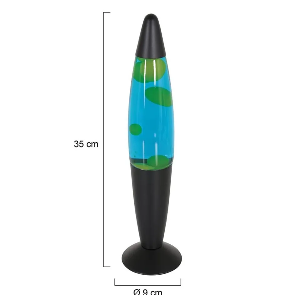 Retro en vintage ineen, deze lavalamp. Wie had deze nou niet op zijn slaapkamer vroeger? De lavalamp zorgt voor een leuke sfeer en decoratie tegelijk. De tafellamp is uitgevoerd in het zwart met helder glas. In het glas zit blauw water met groene vlekken. De speelse tafellamp is een leuke toevoeging voor een kinderkamer of slaapkamer. De lavalamp is voorzien van een zwart snoer met knipschakelaar en wordt geleverd inclusief E14 lichtbron.