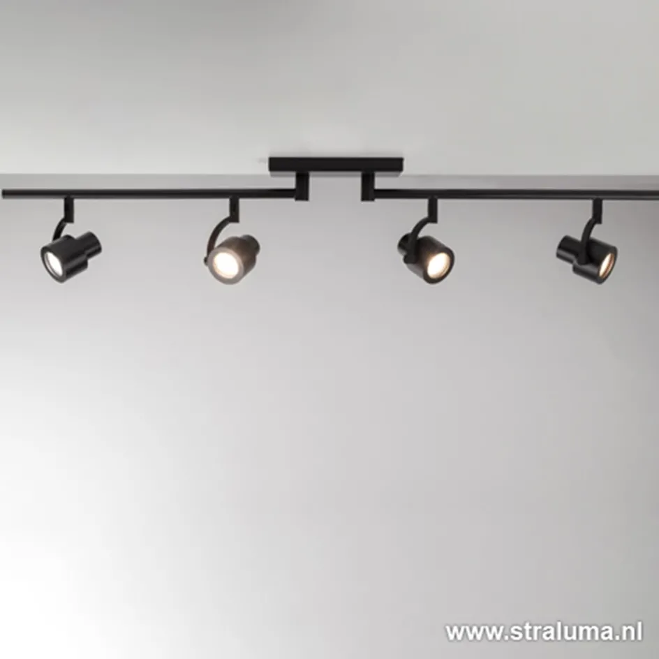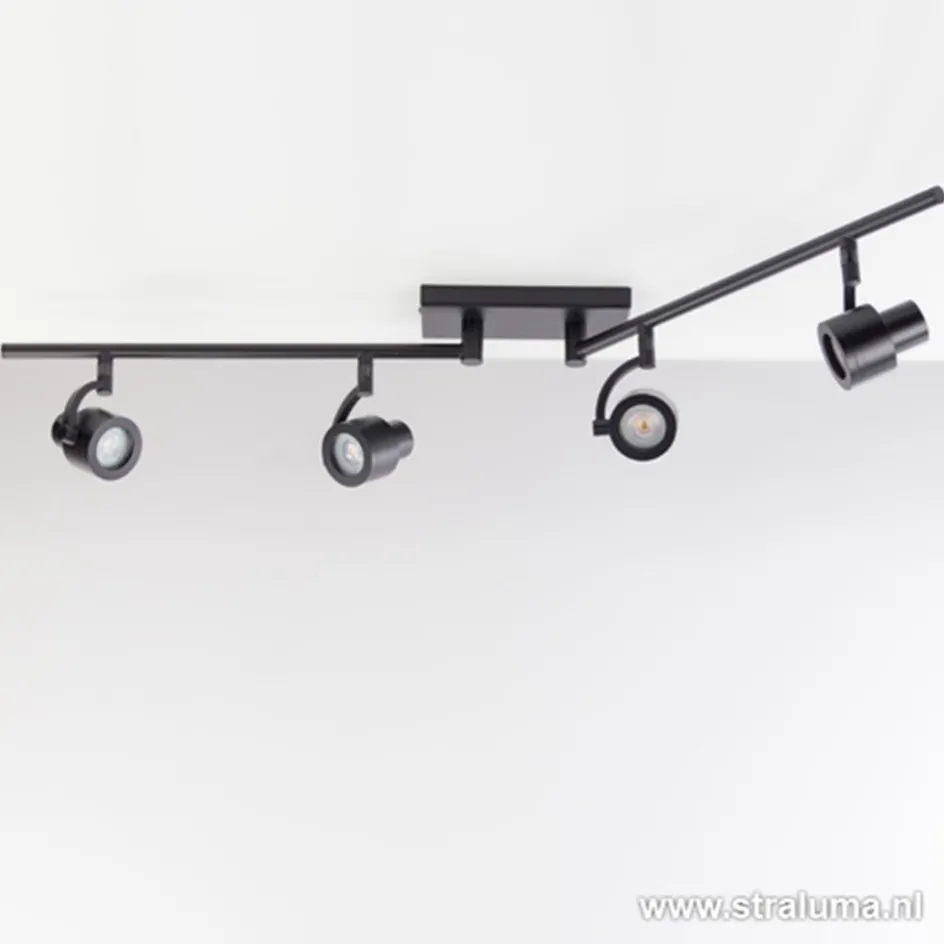 Een strak uitgevoerde zwarte plafondlamp met 4 spots, ideaal voor gebruik in diverse ruimtes zoals de keuken, hal, woonkamer of slaapkamer. Door de het moderne uiterlijk van deze plafondspot is hij ook uitstekend voor in een kantoor. Door de GU10 fitting kunt u hier uw eigen lichtbron in kiezen zoals bijvoorbeeld LED spotjes. Elke arm van deze moderne opbouwspot is draaibaar maar ook de spotjes zelf zijn kantelbaar en draaibaar. Hierdoor kunt u het licht laten schijnen in diverse hoeken van de ruimte. Deze opbouwspot is gemaakt van staal en achteraf in een mat zwarte kleur gespoten.