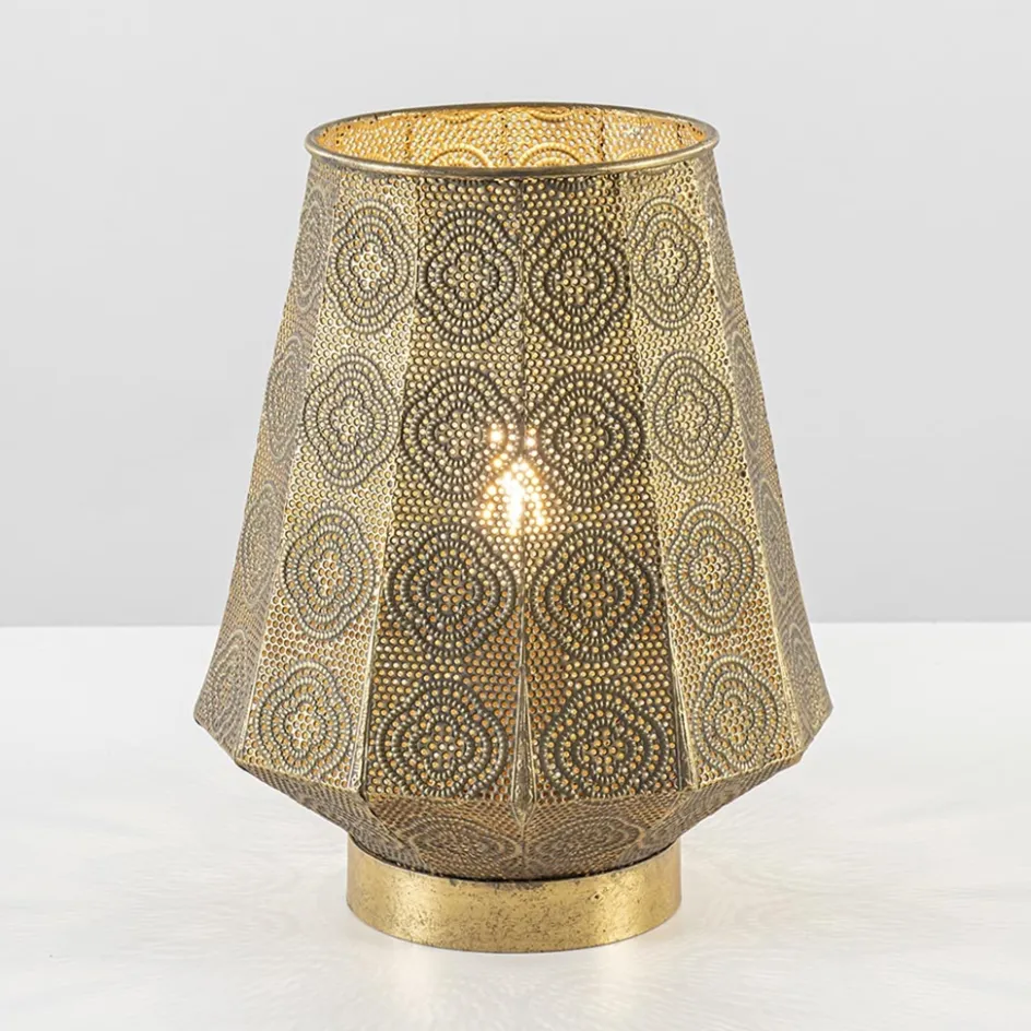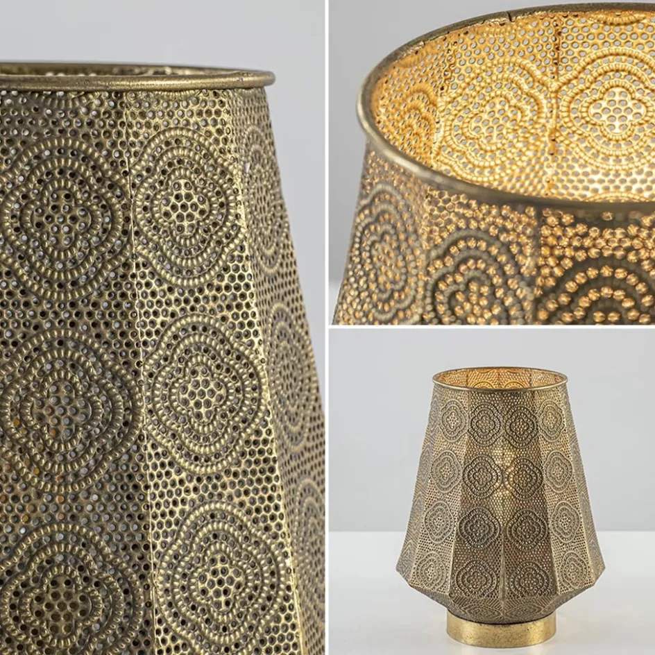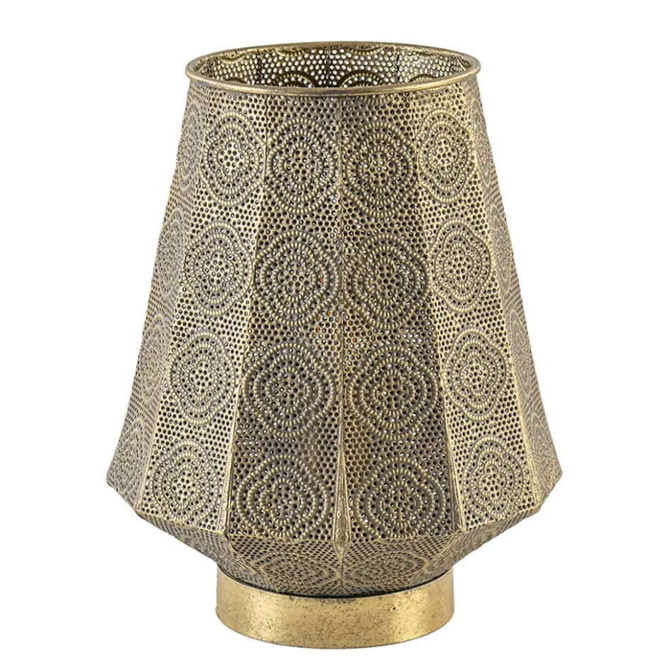 Sfeervol op een dressoir, kast of bijzettafel. Deze lantaarn tafellamp brengt een beetje Oosterse sfeer in huis. De tafellamp is volledig gemaakt van metaal en voorzien van een decoratief dessin welke nog meer opvalt wanneer de lamp wordt ingeschakeld. Het metaal is verder geperforeerd zodat deze voldoende licht kan doorlaten maar er niet direct in de lichtbron kan worden gekeken. De Oosterse tafellamp is uitgevoerd in het goud en heeft een antieke afwerking wat de lantaarn een doorleefde look geeft. De gouden tafellamp met dessin heeft een zwart snoer van 180 cm met een knipschakelaar op 30 cm van de lamp en wordt zonder lichtbron (E27) geleverd.