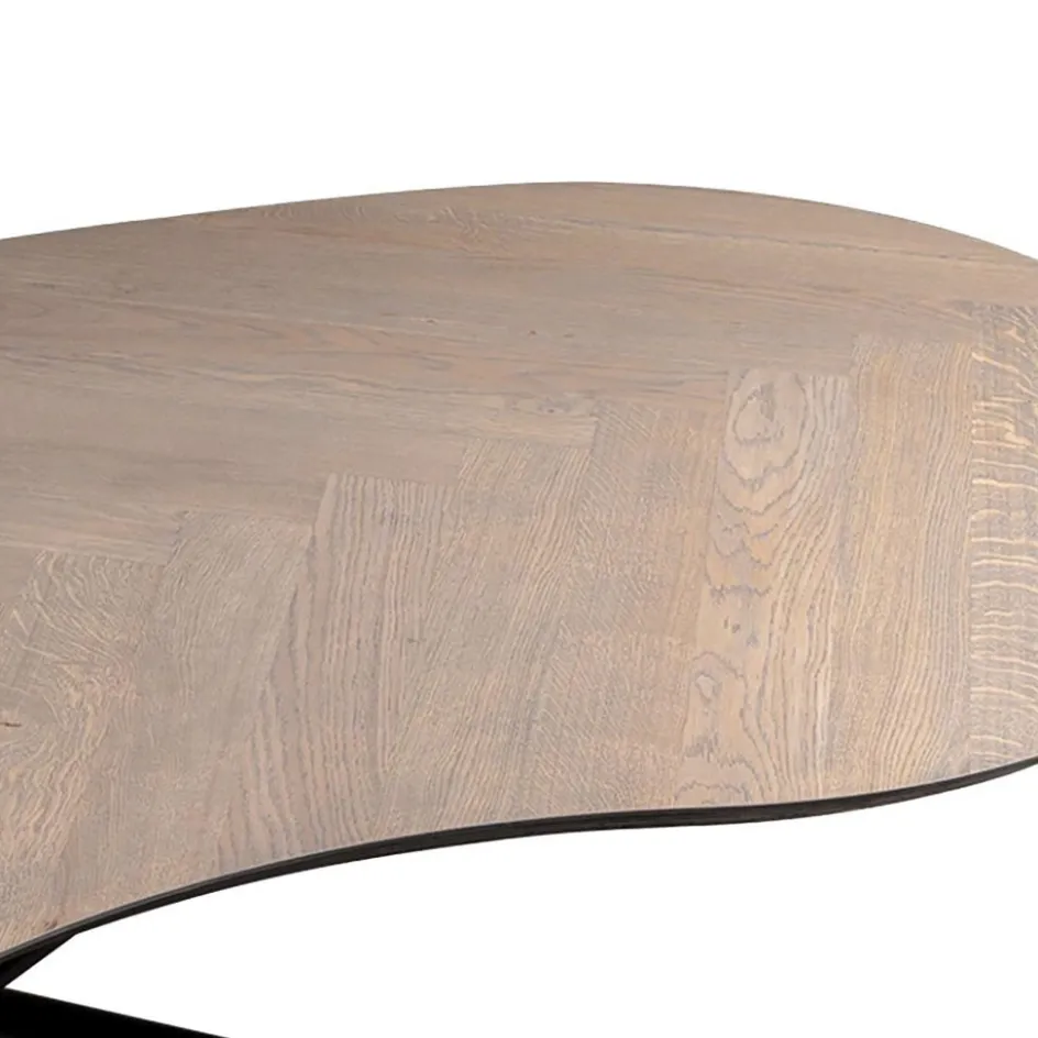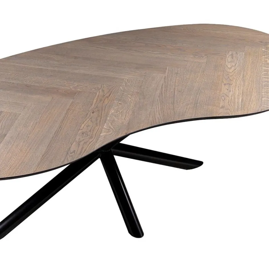 Prachtig van design deze organische ovale tafel. Een trend die steeds vaker gezien wordt. Tafel hoeven niet meer rond of rechthoekig te zijn. Ovale en organische vormen spelen steeds meer een rol. Deze prachtige design tafel heeft een eiken blad dat in visgraat is gelegd. Het blad heeft een dikte van 3 cm en is afgewerkt met een zwarte rand. Deze rand past mooi bij de zwart metalen poot. De eettafel heeft een lengte van 245 cm en een breedte van 120 cm. De tafel is prima te combineren 6 stoelen.
