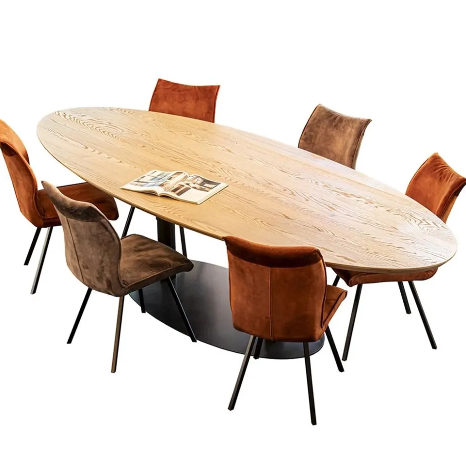 Een prachtige ovale eettafel met een eiken houten blad. Het blad is uitgevoerd in de kleur naturel en is gelakt als afwerking. Het eiken blad heeft een afmeting van 300×120 cm en wordt ondersteund door een stevige metalen poot met een zwarte coating. De ovale eettafel staat prachtig in een hotel chic of robuust interieur en biedt genoeg ruimte van 6 tot 8 stoelen.