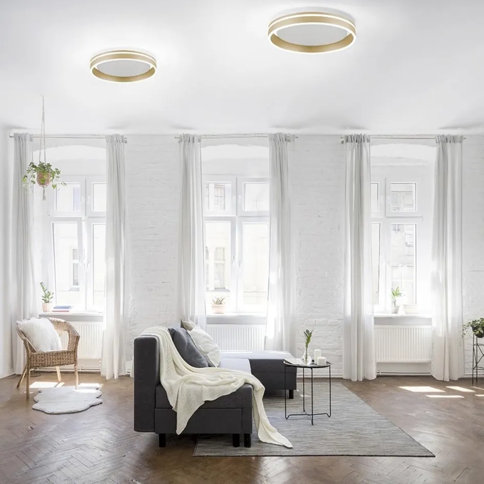 Een mooi strak design met een knipoog naar de klassieke plafonnière. Deze moderne smart plafondlamp is uitgevoerd in het mat messing en gecombineerd met LED. De LED strips in de ring zorgen voor een diffuus licht zowel naar beneden als opzij. De lamp is zowel te dimmen in lichtsterke als in lichtwarmte. De lamp is te bedienen met de bijgeleverde afstandsbediening als met de app. De plafondlamp kan geïntegreerd worden in bestaande smart systemen met een Zigbee standaard.