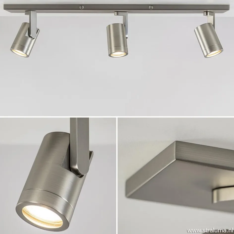 Ideaal voor in een smalle kamer of hal. Deze 3-lichts opbouwspot zorgt voor voldoende licht en doordat de spots zowel te kantelen als te draaien zijn, stelt u de spots gemakkelijk en snel naar de juiste richting. De ronde spots zijn voorzien van een afneembare ring zodat de lichtbron gemakkelijk geplaatst kan worden. De metalen kapjes zijn bevestigd op een L-vormig pootje die is bevestigd op de metalen plafondbalk. De plafondspot krijgt door de matte nikkel afwerking een strakke look die mooi past in diverse woonstijlen.