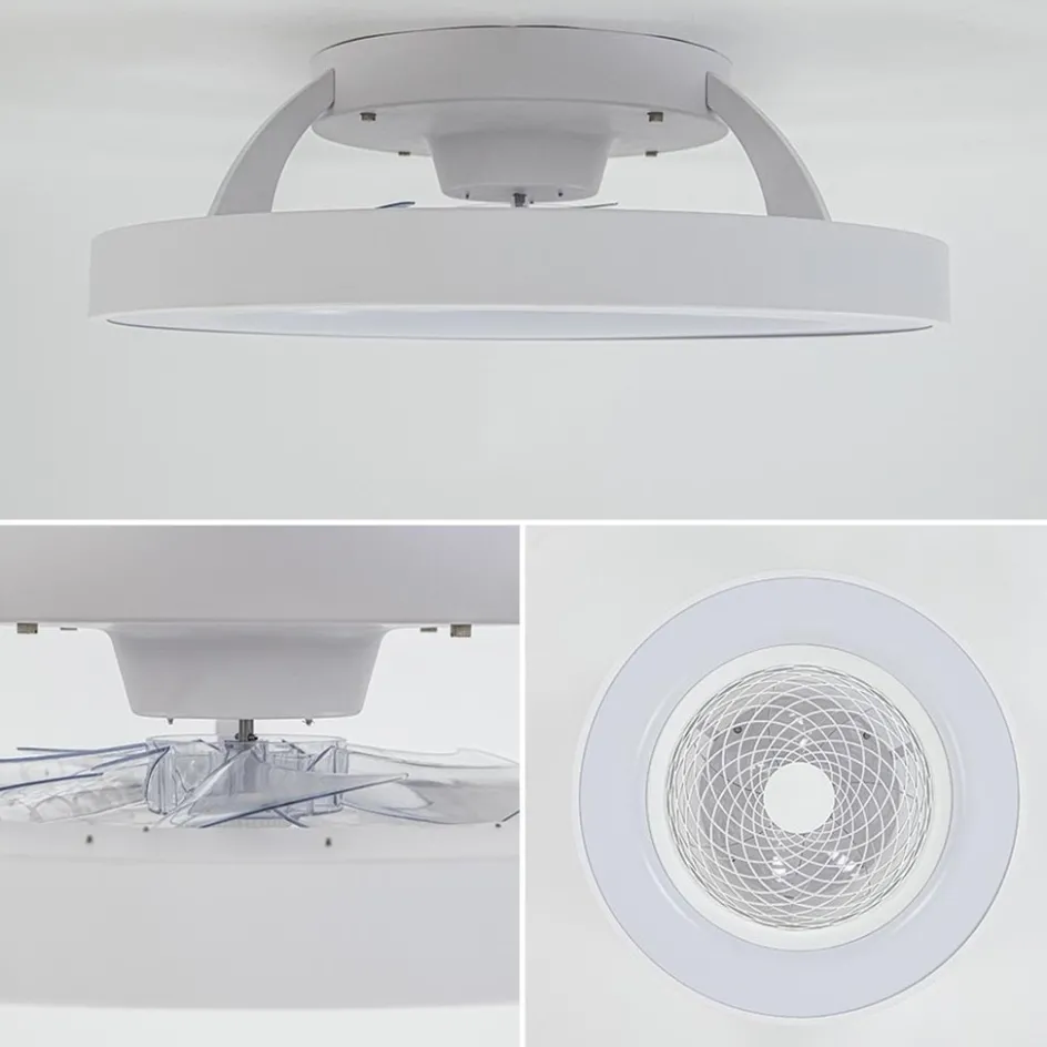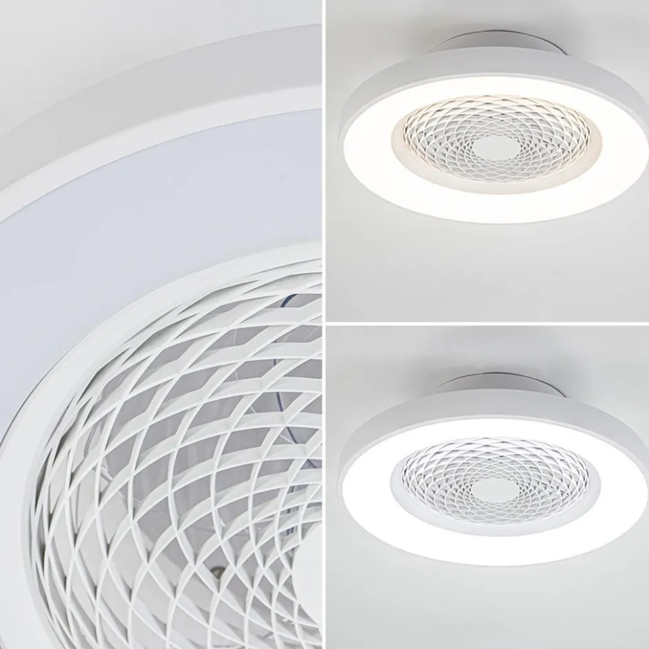 Een moderne plafondventilator met een strak design. Deze ronde ventilator bestaat uit twee delen, de buitenste ring is voorzien van geïntegreerd LED en de binnenste ring behuisd de ventilator. Het mooie is ook dat de ventilator en de lamp zijn te bedienen via de meegeleverde afstandsbediening, maar ook gemakkelijk met uw smartphone. Middels een app en bluetooth linkt u de ventilator gemakkelijk met uw smartphone en stelt u snel de gewenste snelheid van de ventilator in of dimt u de verlichting. De LED verlichting is in te stellen qua kleur en intensiteit, ideaal voor in de woonkamer of slaapkamer. De moderne plafondventilator met lamp heeft een zomer en een winter stand zodat u deze het hele jaar door kunt gebruiken.