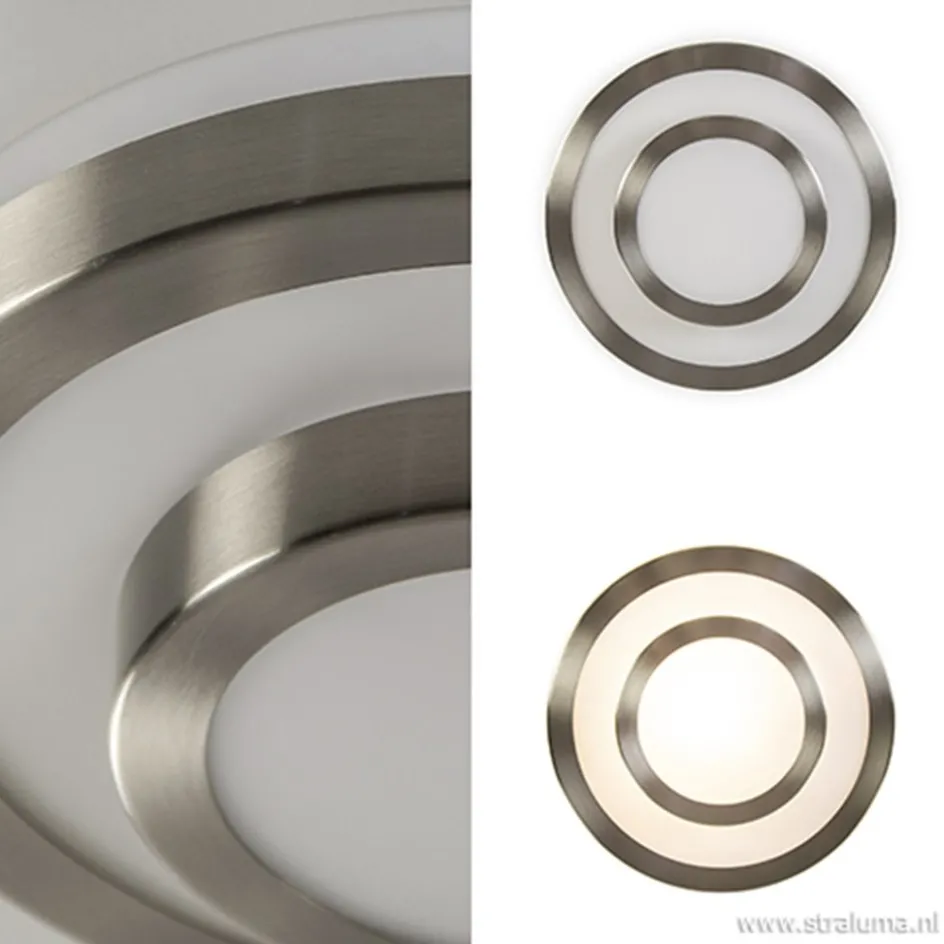 Het model van een klassieke plafonnière, maar dan in een modern jasje. Deze plafondlamp is voorzien van twee lagen waar opaal glas in zit verwerkt. Dit laat zachte en sfeervolle verlichting door. De kap draait gemakkelijk van de bevestiging af zodat de lamp kan worden aangesloten en de lichtbron kan worden geplaatst. De nikkel plafondlamp is conform IP44, zodat deze perfect past in een badkamer. Daarnaast past de lamp vanwege z’n formaat ook mooi in een kleinere ruimte als een toilet, hal of overloop.
