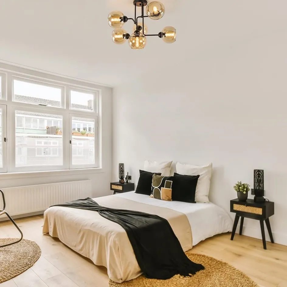 Retro met een klassieke touch. Deze plafondlamp is mooi te combineren in diverse woonstijlen en door z’n grootte in diverse ruimtes. Ideaal voor in een hal, slaapkamer of woonkamer. De 6-lichts plafondlamp heeft een metalen armatuur dat is voorzien van een mat zwarte finish. Dit is gecombineerd met amber glazen bollen die de lamp helemaal afmaken. Het speelse armatuur zorgt ervoor dat de lamp er vanuit iedere hoek anders uit ziet. Het warme glas geeft de lamp een klassieke uitstraling. De 6-lichts plafondlamp met glazen bollen is dimbaar middels een externe dimmer en wordt geleverd exclusief lichtbronnen.