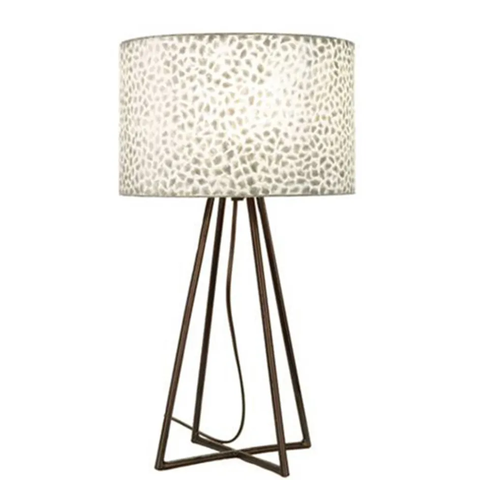 Een leuke moderne lamp met een decoratieve kap. De schelpen kap heeft een parelmoer witte kleur wat mooi past bij de zwarte metalen voet. Door de kleur en de capiz schelpen die in de kap verwerkt zitten, geeft de lamp een mooie sfeervolle verlichting. Deze tafellamp is zowel aan als uit een mooie decoratieve toevoeging aan het interieur die zorgt voor een warme gezellige sfeer.