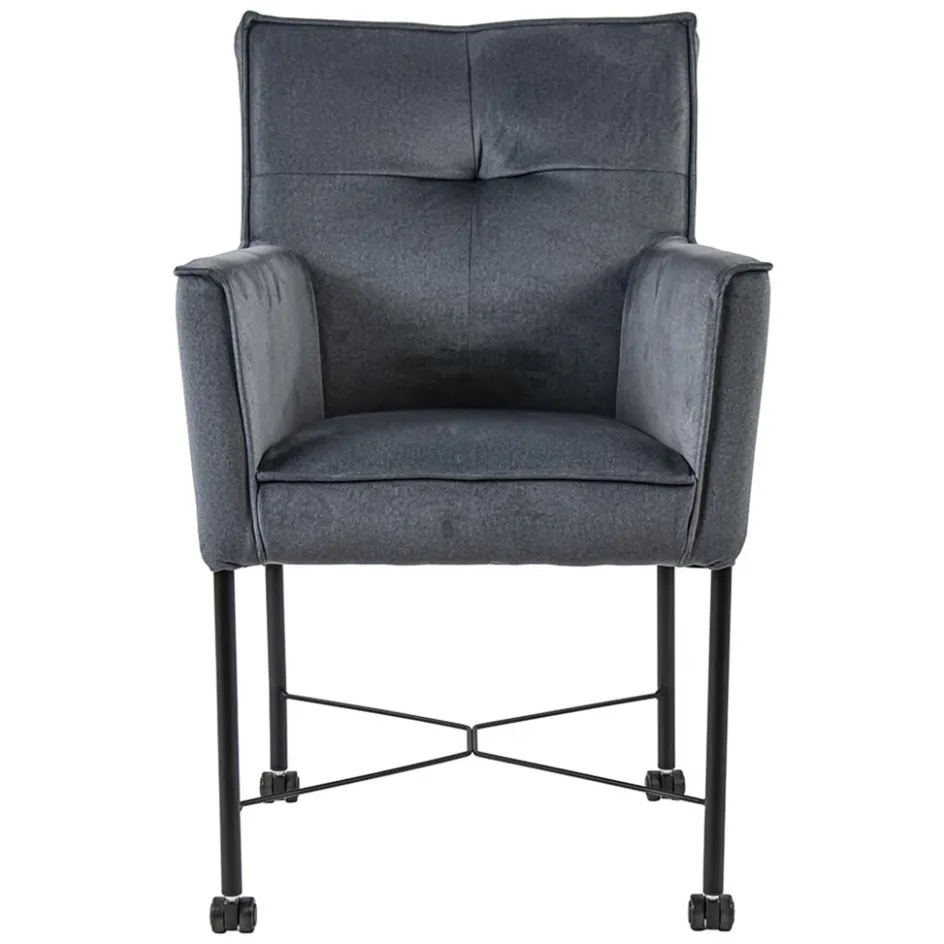 Deze eetkamerstoel is voorzien van een fijne zachte stof in het grijs/blauw. Dit geeft een fijn zitcomfort dat mede door de armleuning wordt vergroot. Ideaal om heerlijk in te tafelen of borrelen. De armstoel heeft een hoge rugleuning en een metalen poot in het mat zwart. Voor extra gemak staat de stoel op zwarte wieltjes.