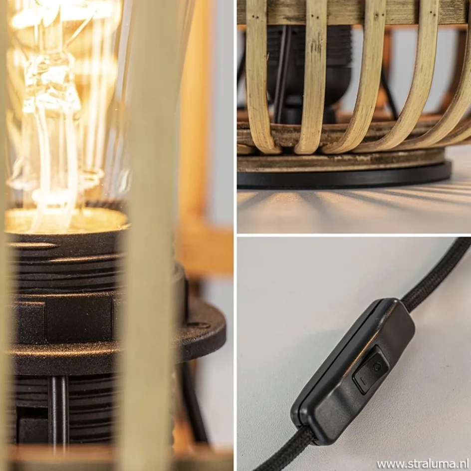 Deze kleine tafellamp brengt een hoop sfeer en warmte met zich mee. De rotan tafellamp is volledig van hout wat mooi past in een landelijk of botanisch interieur. De rotan kooi wordt ondersteund door een zwarte ronde voet die is voorzien van een zwart stof omwonden snoer van 145 cm, met een knipschakelaar op 25 cm van de lamp. De bamboe tafellamp heeft een zwarte E27 fitting en wordt geleverd zonder lichtbron. De sfeervolle lantaarn tafellamp staat leuk in een woonkamer maar zorgt ook voor een fijne sfeer in een slaapkamer.
