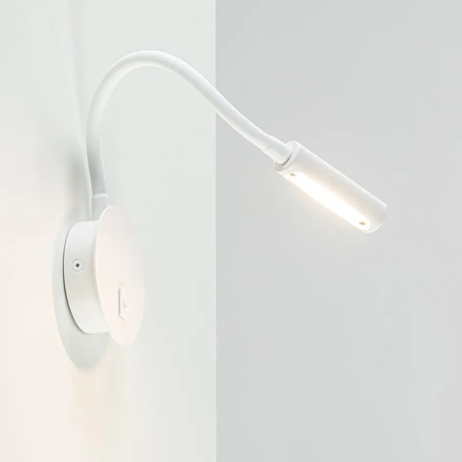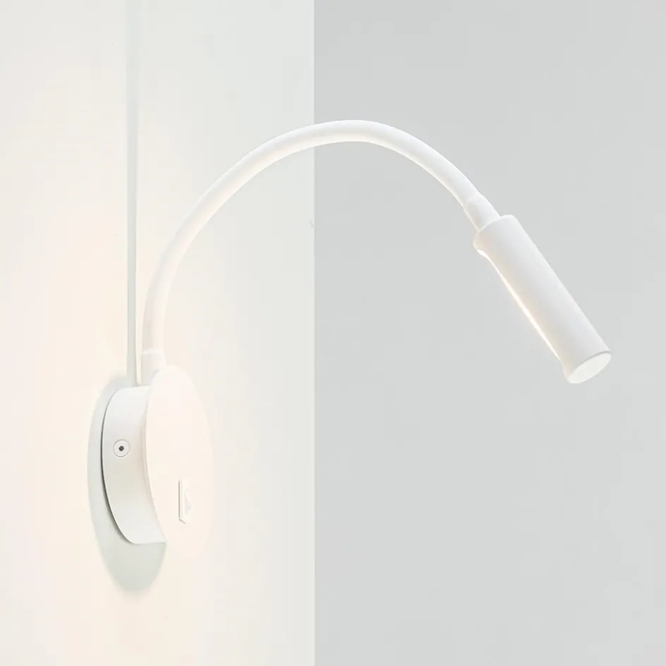 Een perfect lampje voor naast uw bed. De kleine wandlamp is gemaakt van metaal en uitgevoerd in het wit. Dit geeft het wandlampje een moderne look. Ideaal aan de witte wandlamp is dat deze is voorzien van een flexibele arm zodat u gemakkelijk de arm kunt verstellen. Erg handig wanneer u voor het slapen nog even wilt lezen. De verstelbare wandlamp is verder voorzien van geïntegreerd LED en heeft een schakelaar op de ronde bevestiging. De moderne wandlamp is niet voorzien van een snoer en dient dan ook direct op een stroompunt te worden aangesloten.