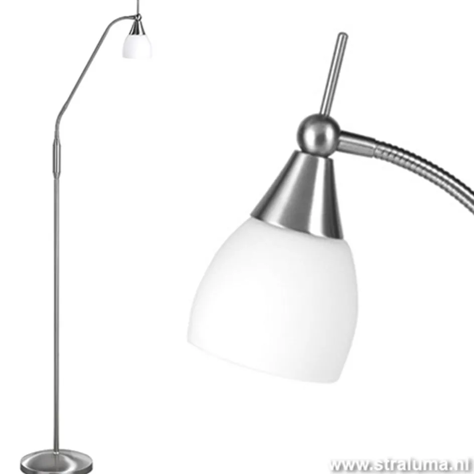 Deze vloerlamp van de serie Touchy is uitgevoerd in het nikkel met een wit glazen kapje. Het is een heel gebruiksvriendelijke lamp: door de touchdimmer op het armatuur kunt u de lichtsterkte aanpassen en door het dubbele flexgedeelte in de leesarm is deze lamp verstelbaar in elke gewenste richting. Hij geeft dus niet alleen functioneel licht, maar kan door de dimmogelijkheid ook heel sfeervol zijn. De totalte lengte van de leesarm na de dimmer is 40cm.